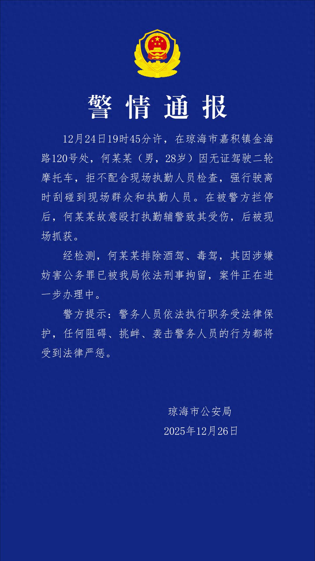 12月24日19时45分许,在琼海市嘉积镇金海路120号处,何某某(男,28岁)因无证驾驶二轮摩托车,拒不配合现场执勤人员检查,强行驶离时刮碰到现场群众和执勤人员。在被警方拦停后,何某某故意殴打执勤辅警致其受伤,后被现场抓获。