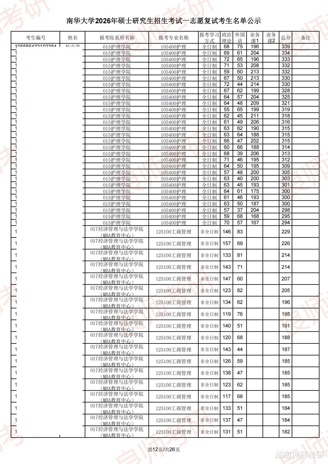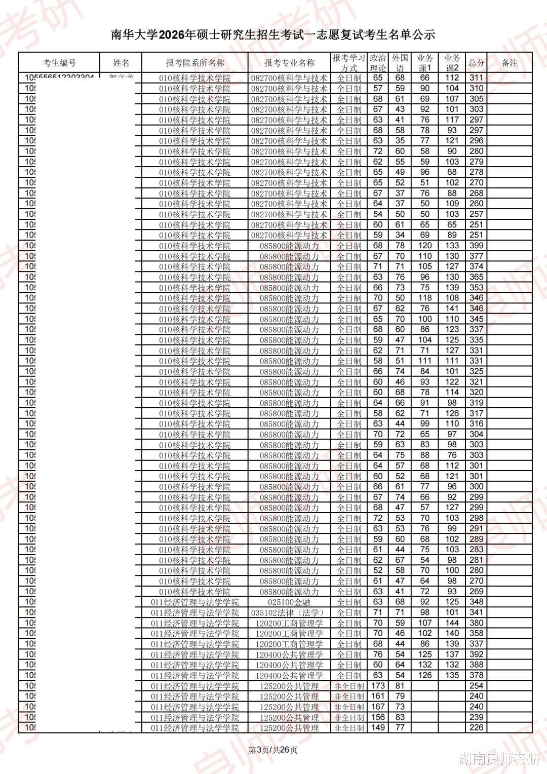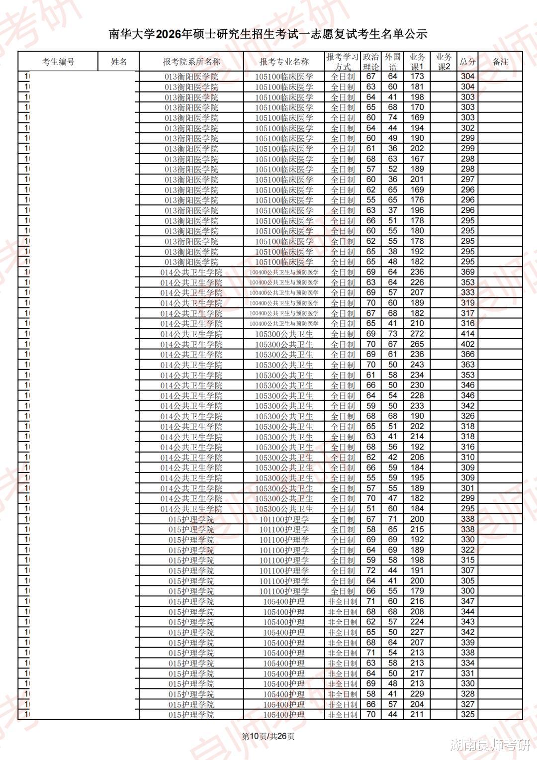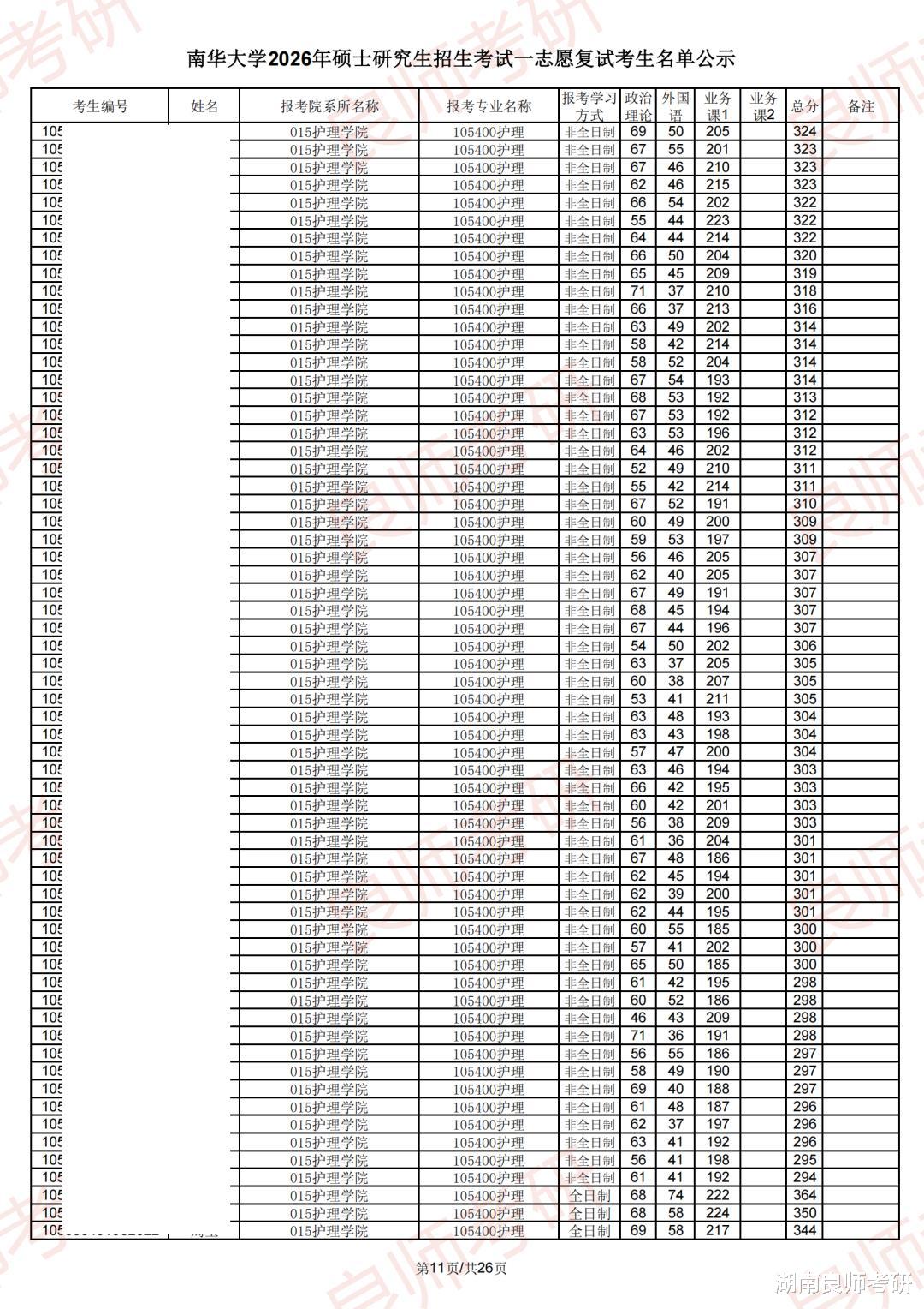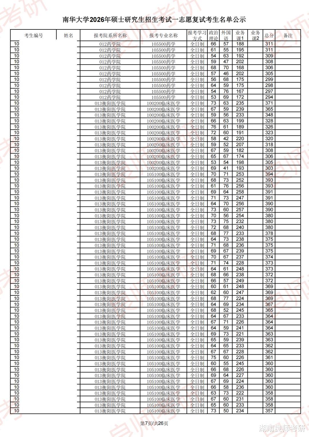 南华大学一志愿复试名单(部分)