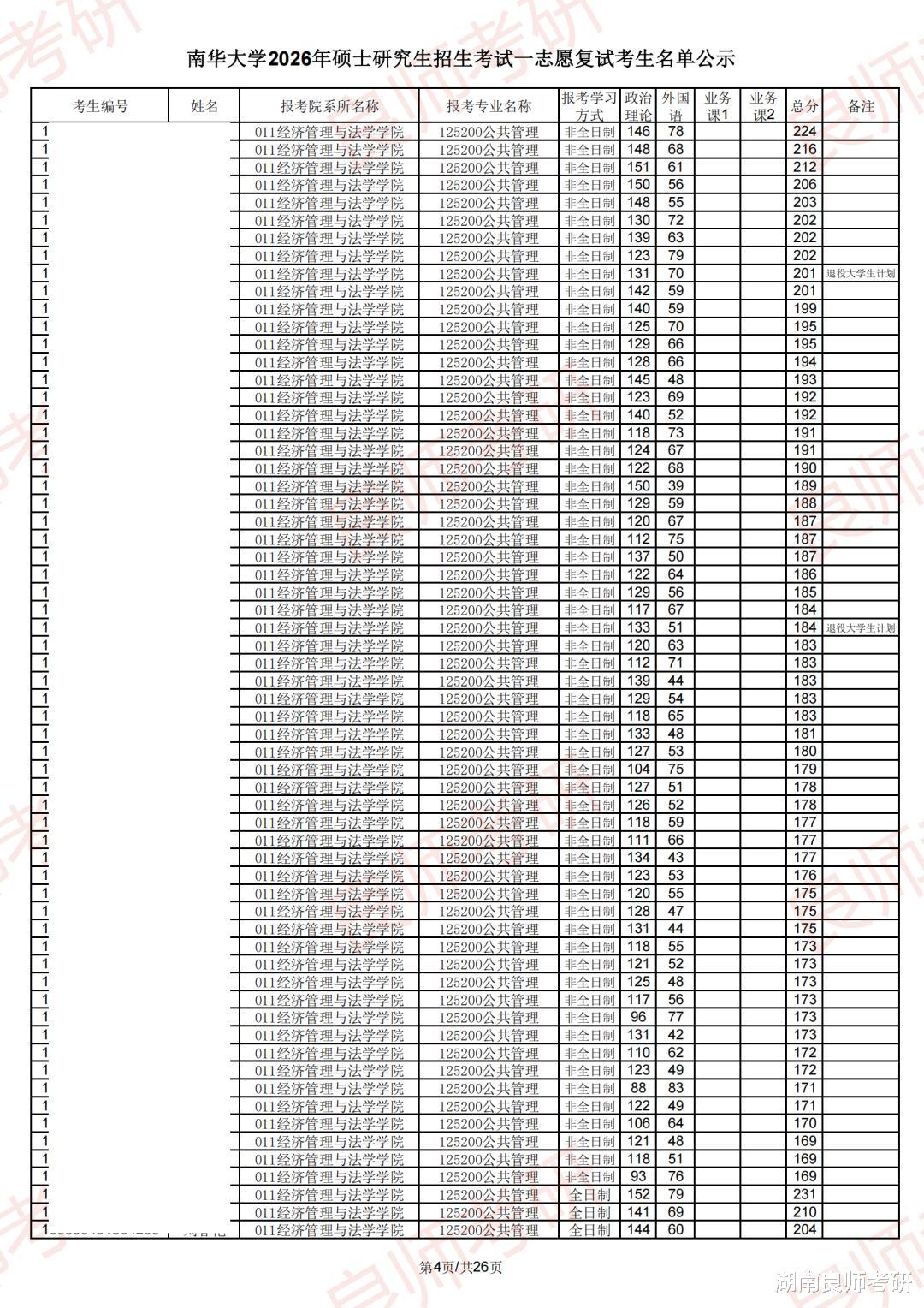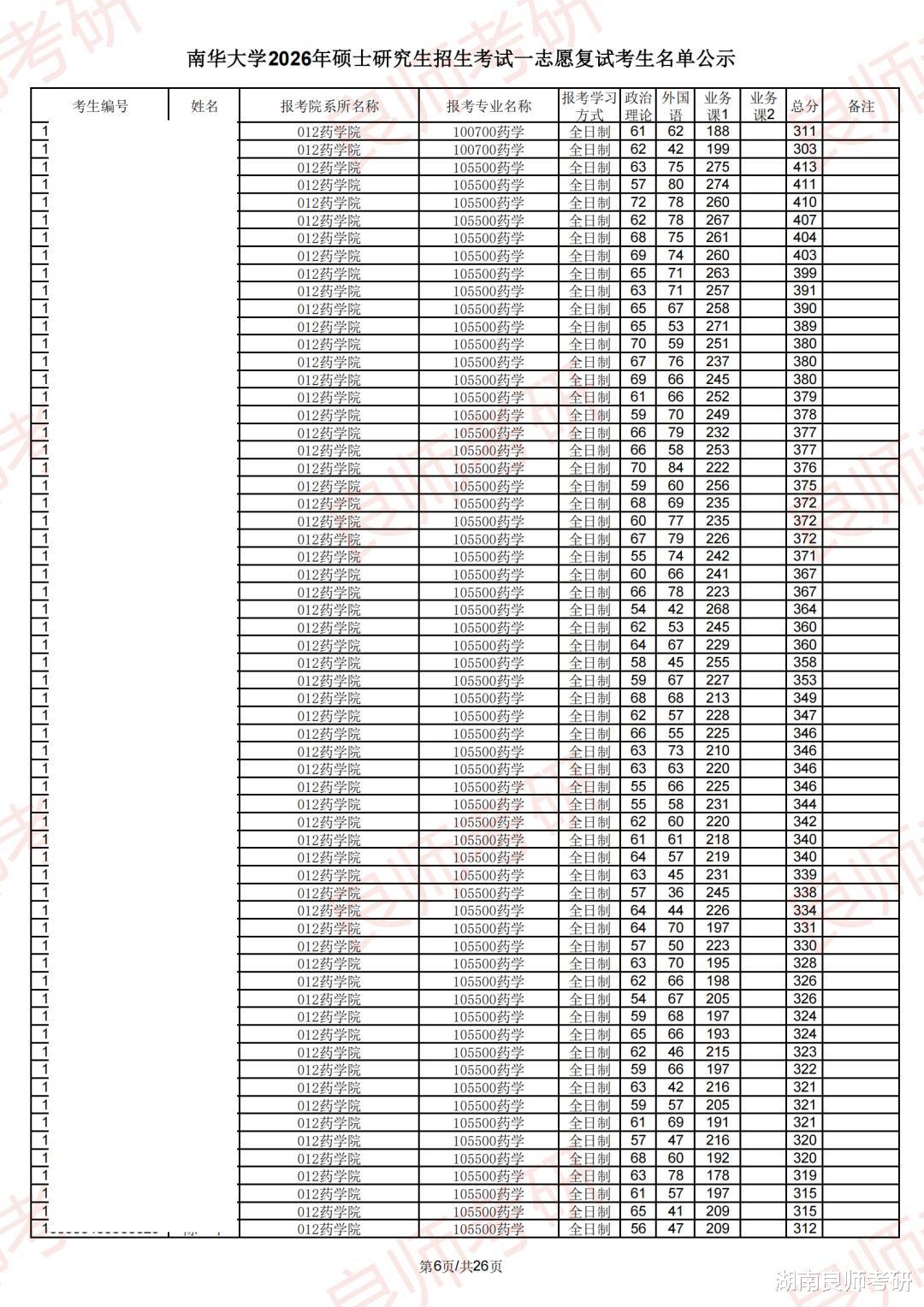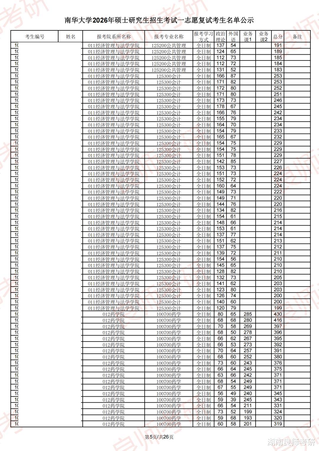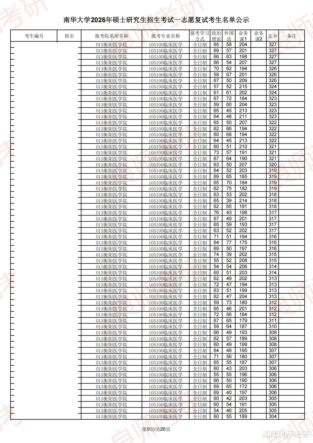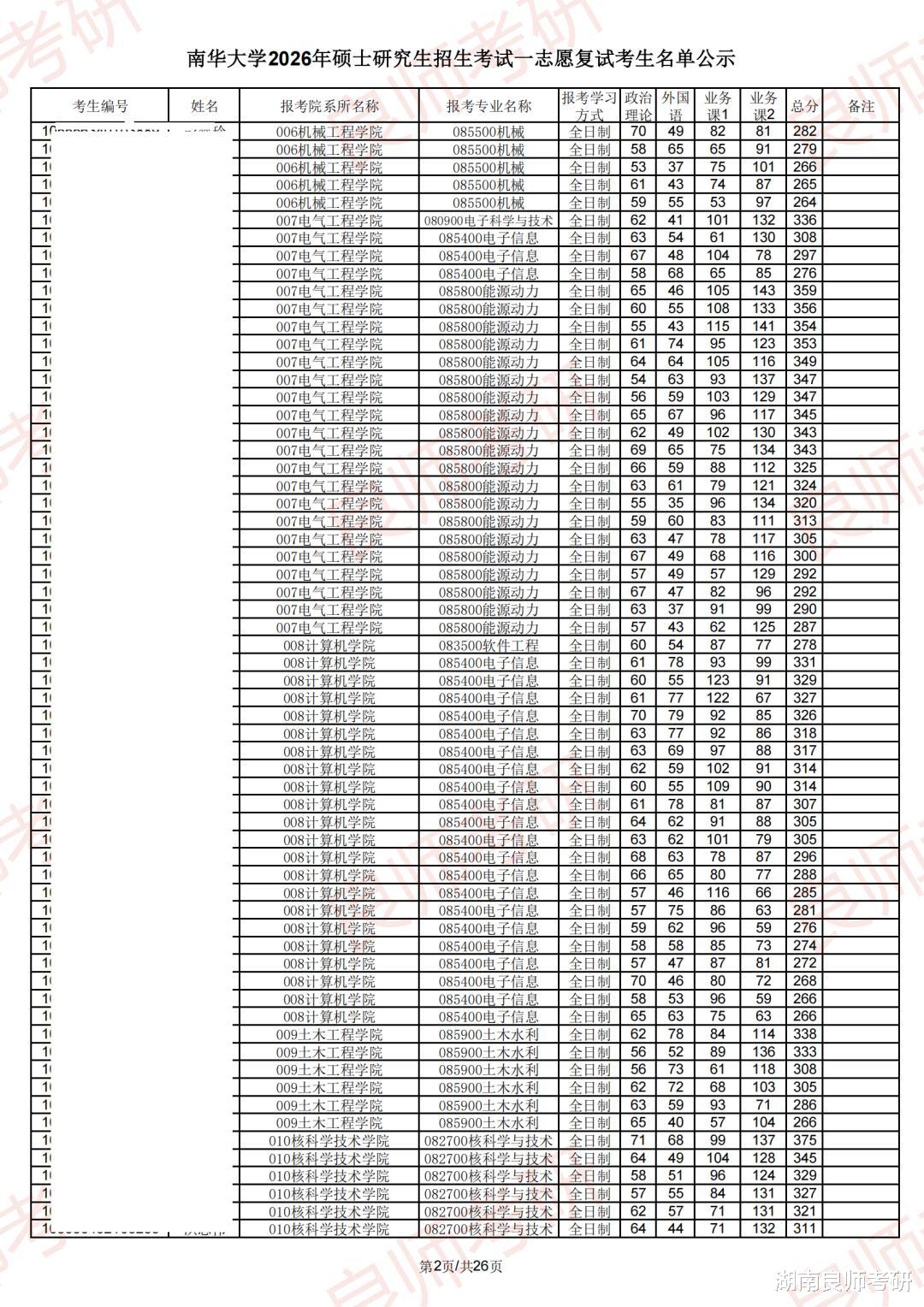 南华大学一志愿复试名单(部分)