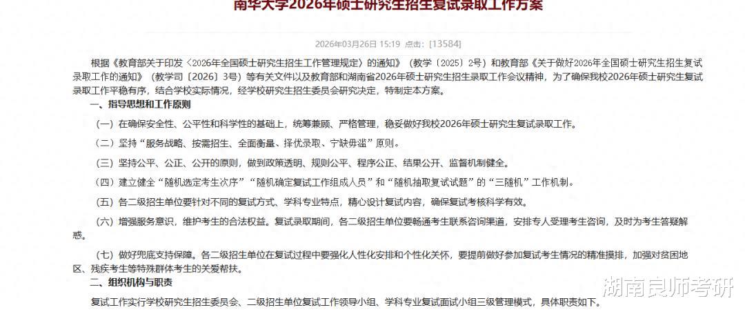 南华大学终于发布了《南华大学2026年硕士研究生招生复试录取工作方案》,一起来看看!