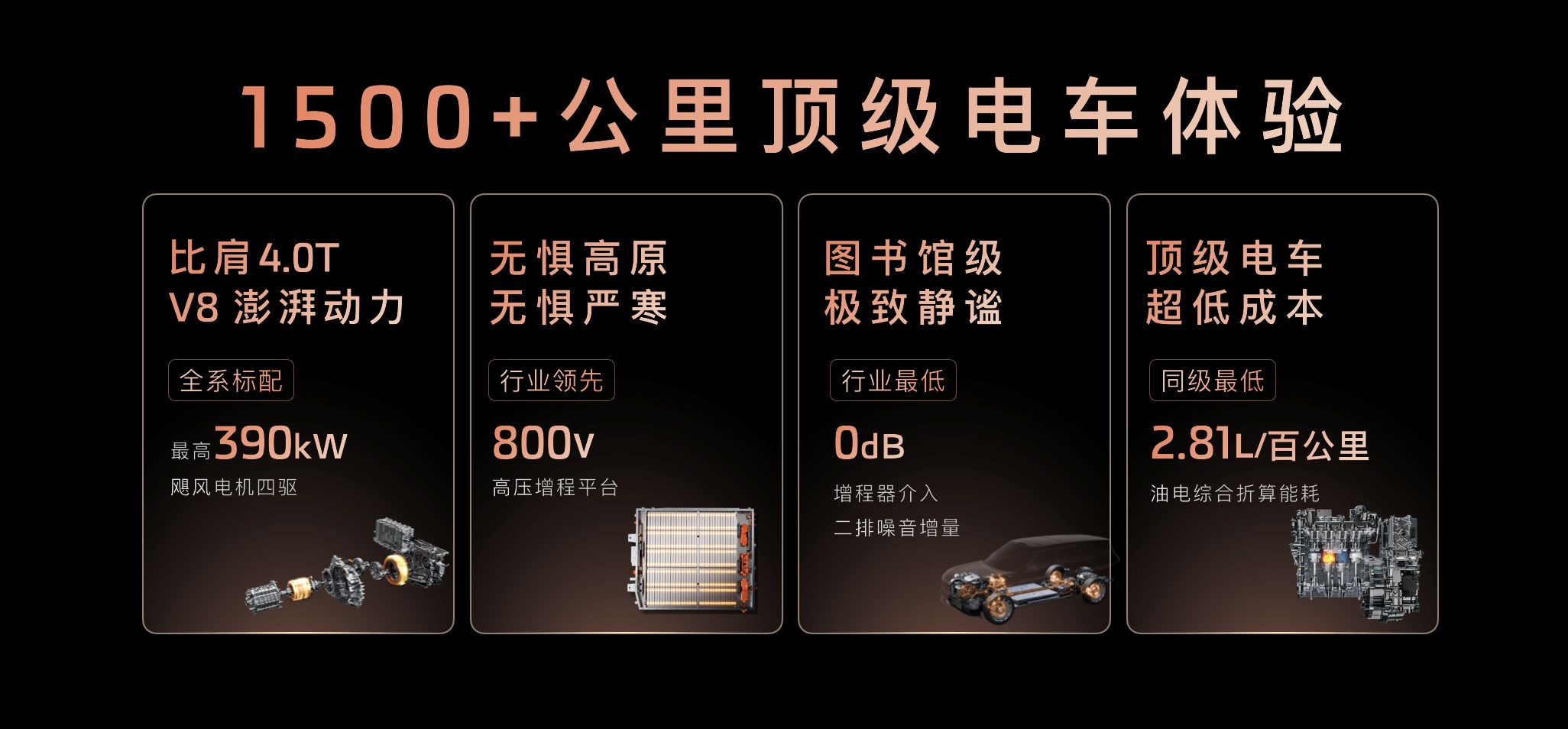 动力更是直接拉满,全系双电机四驱,800V架构,零百加速4秒多,而且有“恒星超级增程”,无论高原还是极寒,都能保证稳稳的爆发力。综合续航突破1500km,油电能耗低到2.8L/百公里,真正把“又强又省”做到极致。
