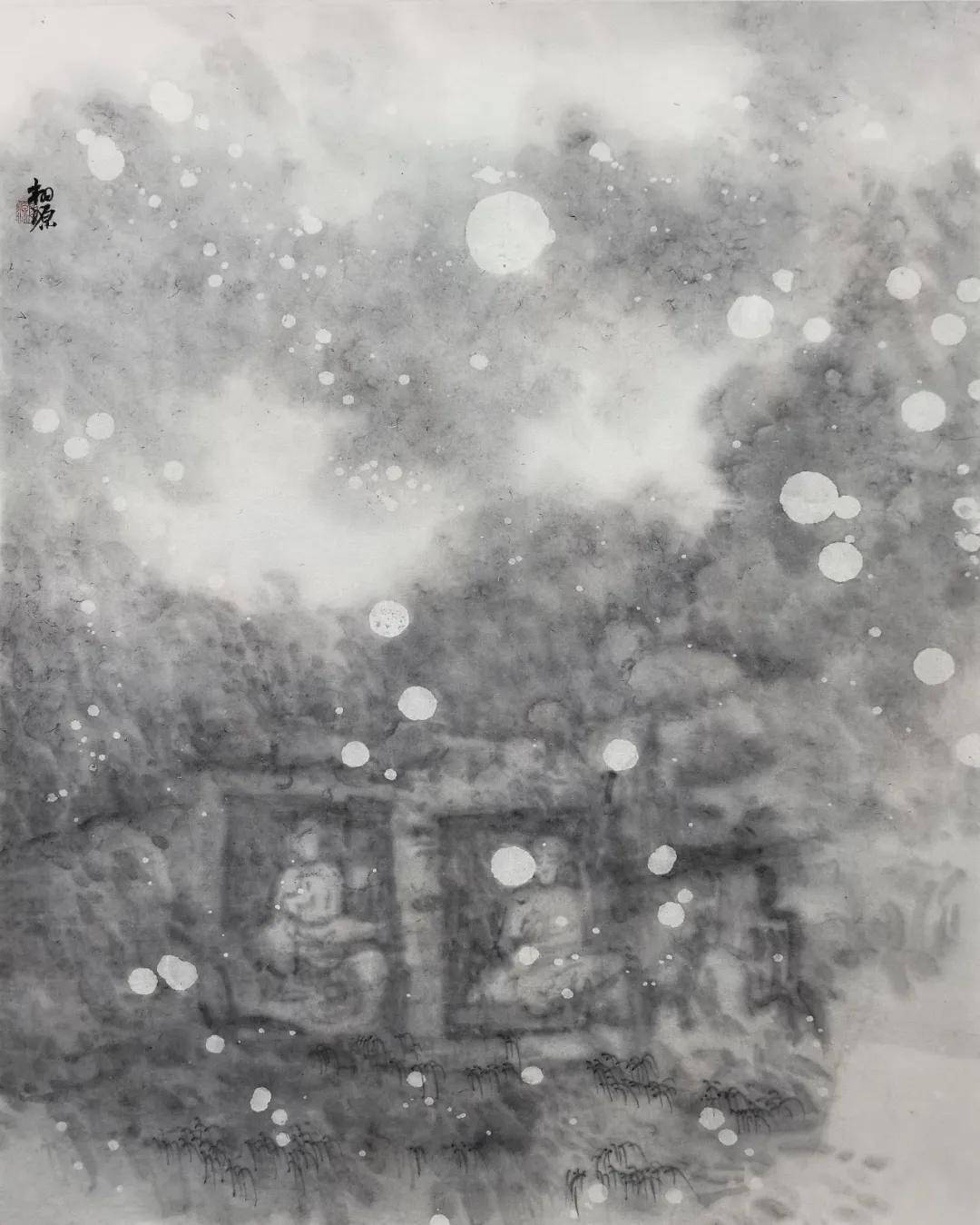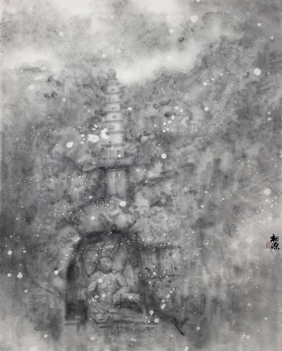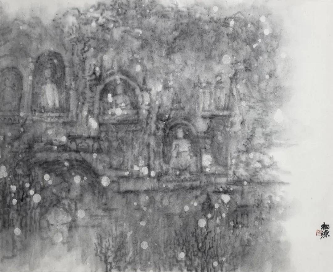 今之所作,已非寻常山水。每至夜深人静,对稿凝神,恍见当年工匠悬岩凿石,錾声丁丁;善女信士长跪合掌,默祷声声。余之笔墨,不过替古人传未尽之言,为来者留可思之境。技术之有无,形式之新旧,至此皆成小事。