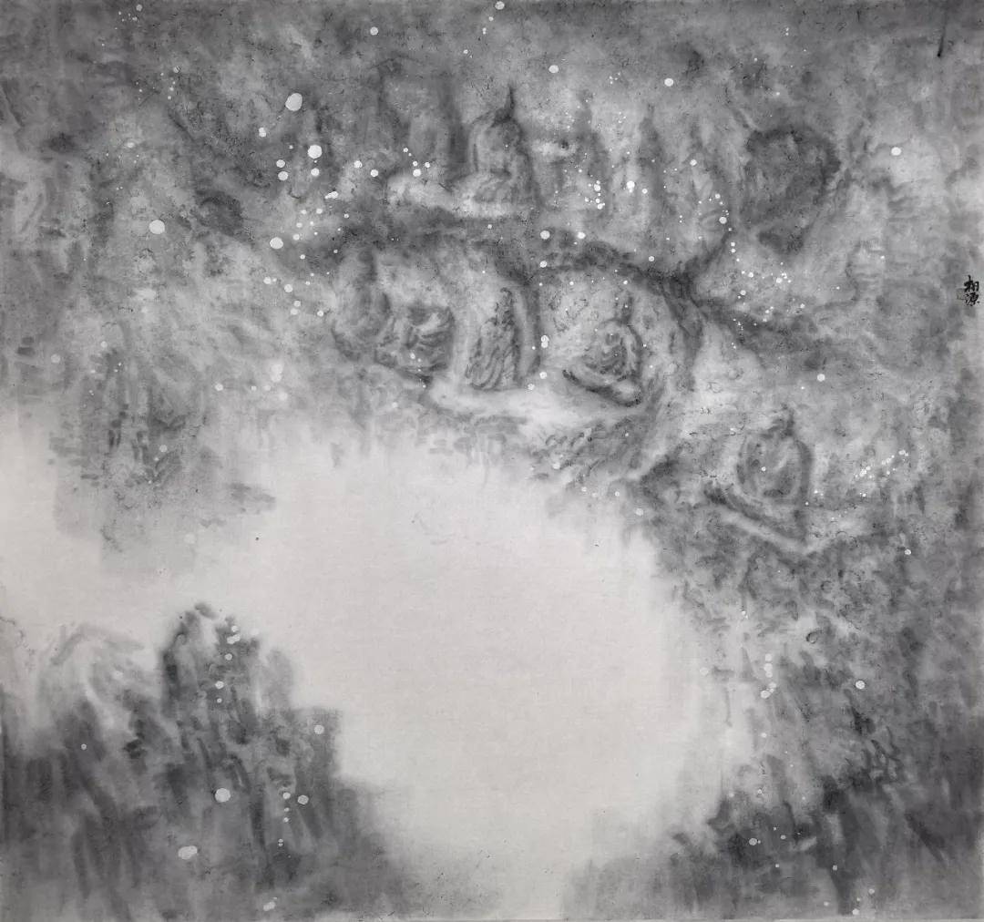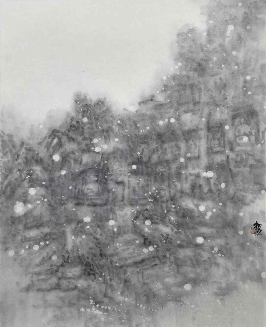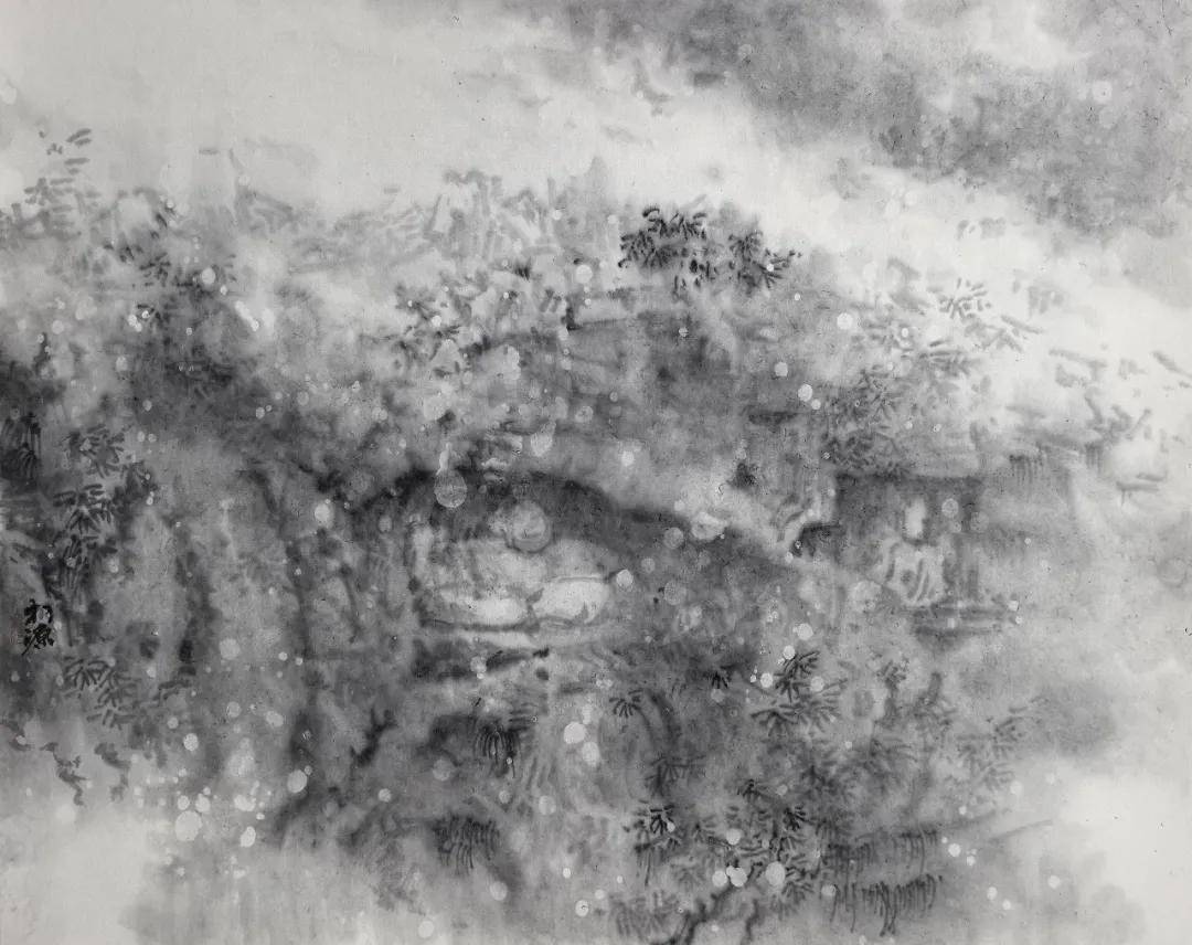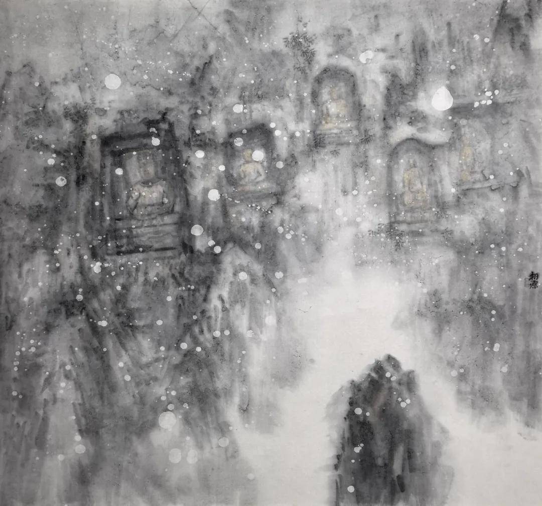 其艺术高明之处,在于一个“舍”字。他舍去驾轻就熟的传统技法,舍去形神兼备的外在诱惑,更舍去取悦于人的匠气,以“去技术化”的浑蒙写意,晕染出朦胧空灵之境。在飞来峰系列作品中,佛像隐于山,山隐于云烟,云烟生于我心,石像斑驳是时间的痕迹,笔墨氤氲是心波的荡漾。这已非传统意义上的山水画,而是以水墨为载体的“心印”,是与千年佛陀、古匠信众的精神对坐,是笔墨间与千年时光的相互凝望。