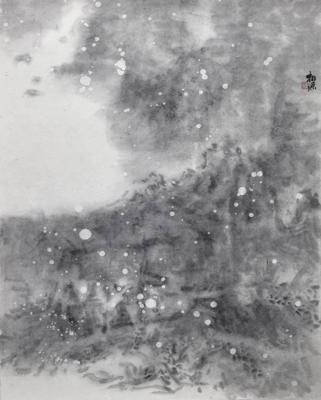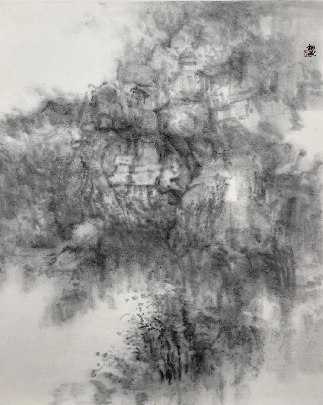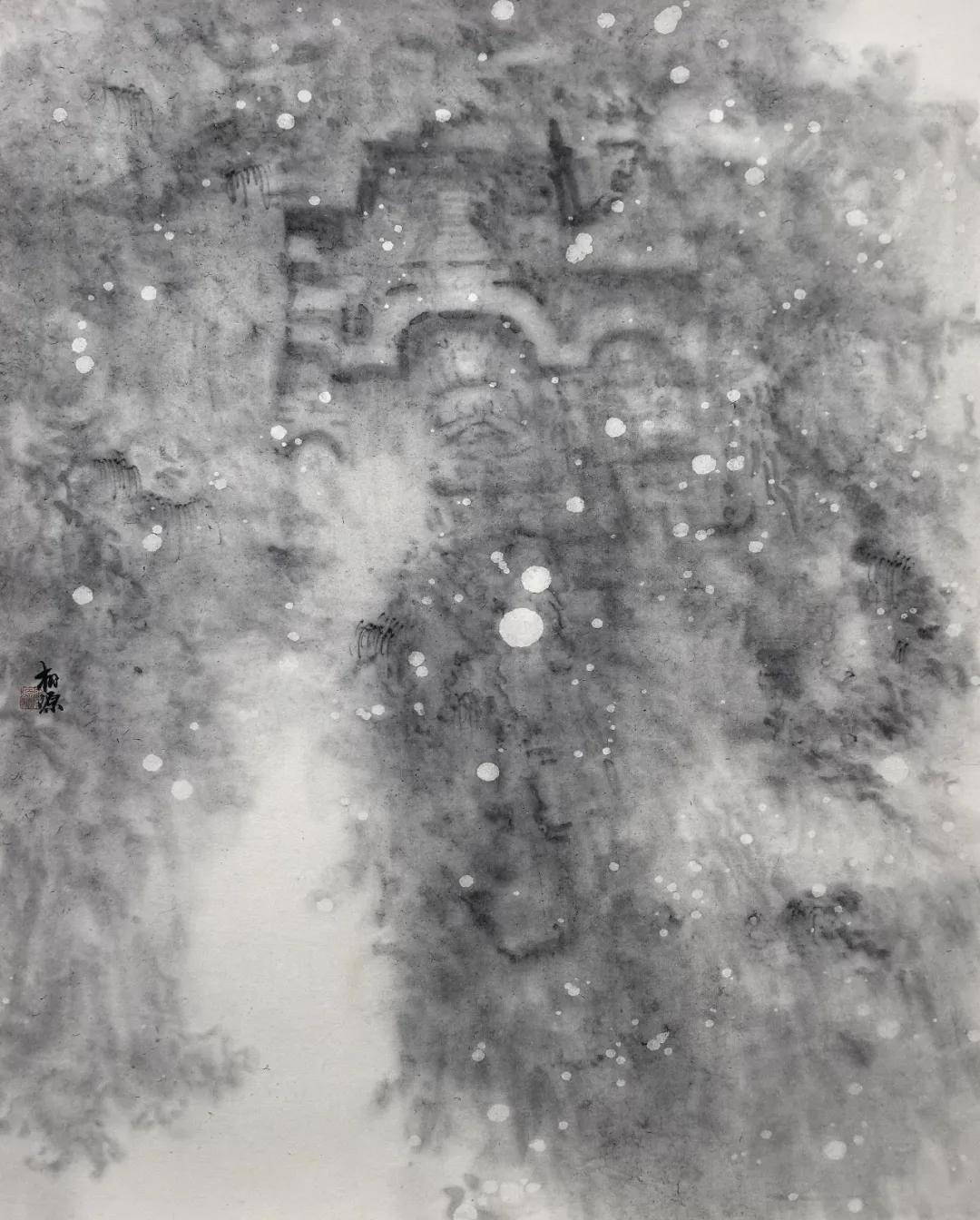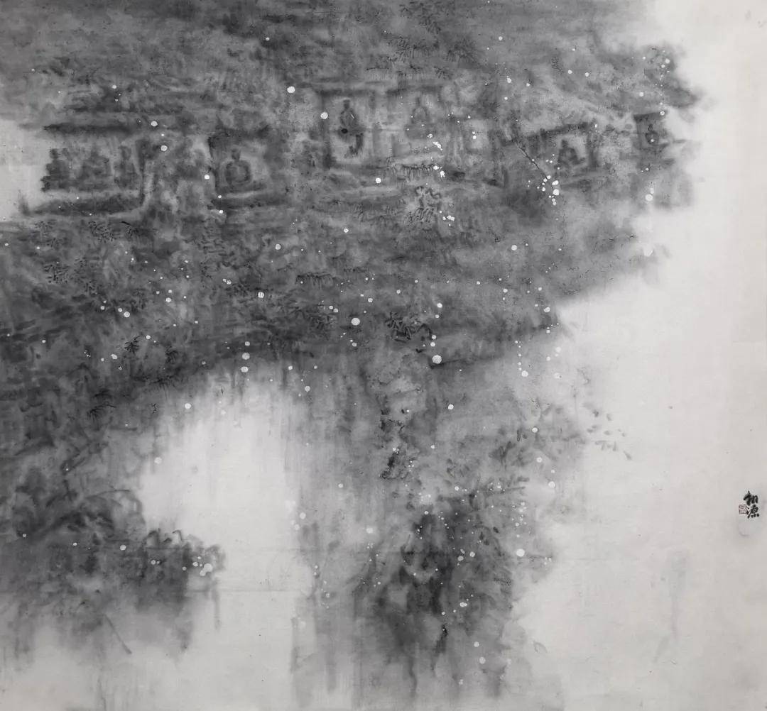 其艺术高明之处,在于一个“舍”字。他舍去驾轻就熟的传统技法,舍去形神兼备的外在诱惑,更舍去取悦于人的匠气,以“去技术化”的浑蒙写意,晕染出朦胧空灵之境。在飞来峰系列作品中,佛像隐于山,山隐于云烟,云烟生于我心,石像斑驳是时间的痕迹,笔墨氤氲是心波的荡漾。这已非传统意义上的山水画,而是以水墨为载体的“心印”,是与千年佛陀、古匠信众的精神对坐,是笔墨间与千年时光的相互凝望。