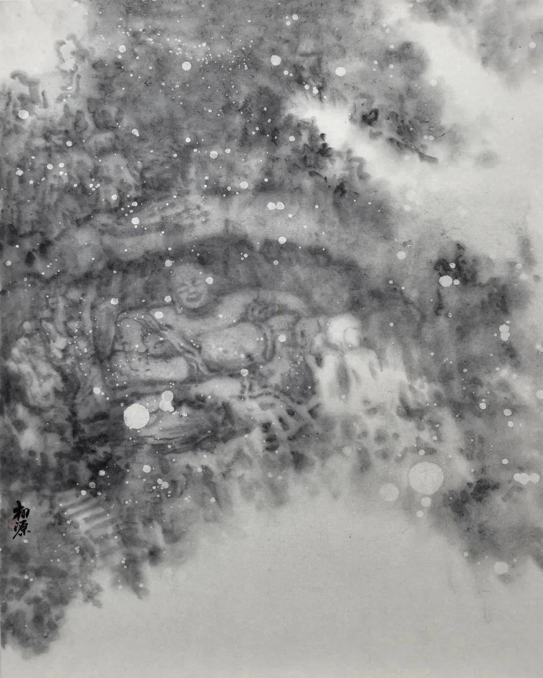 自此,笔下物象渐次模糊。传统皴法,前人程式,忽觉不足以承载此刻心境。遂有意“去技术化”,以浑蒙之笔,写朦胧之境。非不能精工,实不愿以技巧蔽真心也。佛像在石,亦在云烟处;山水为形,亦为心影。观者但见满纸氤氲,不知是我看千年,还是千年看我。