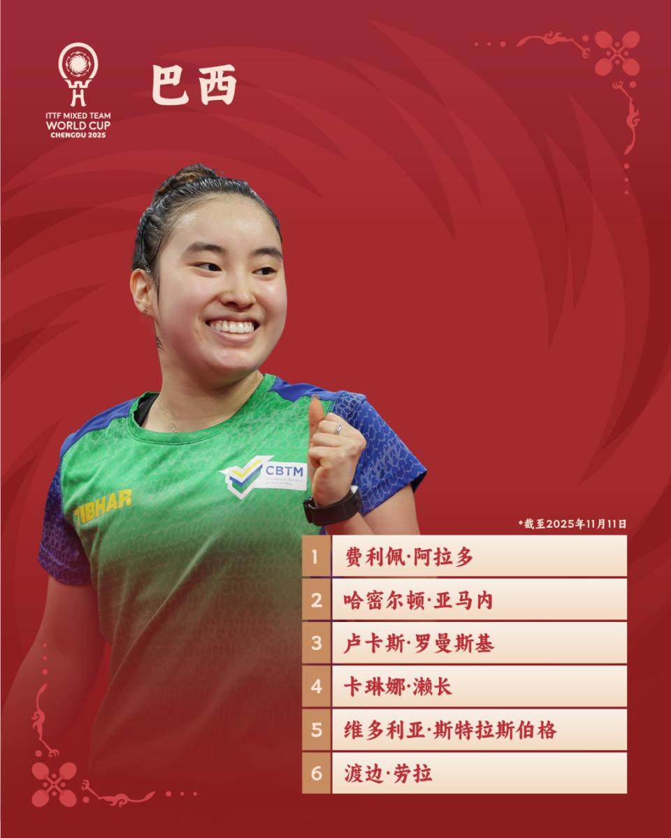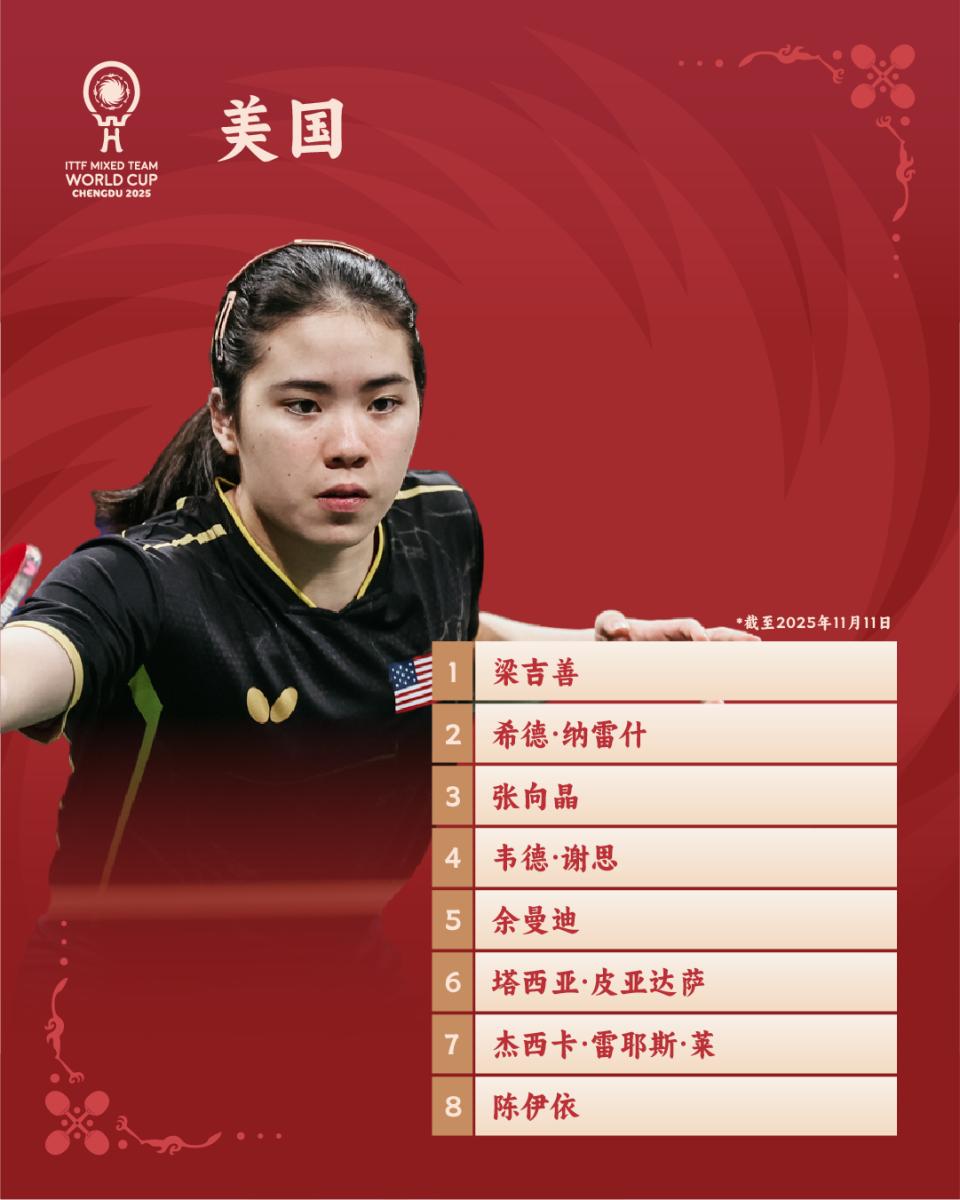 北京时间11月12日,国际乒联在官方平台公布即将于11月30日-12月7日在成都举行的第三届混团世界杯各队参赛名单。中国队由王楚钦、孙颖莎领衔,国乒全主力出战。今年4月国际奥委会执委会决定,在2028年洛杉矶奥运会新增乒乓球混合团体项目,这次混团世界杯共有16支队伍参赛,但瑞典名将莫雷加德、美国一姐张安巴西的卡尔德拉诺等名将不会来成都参赛。