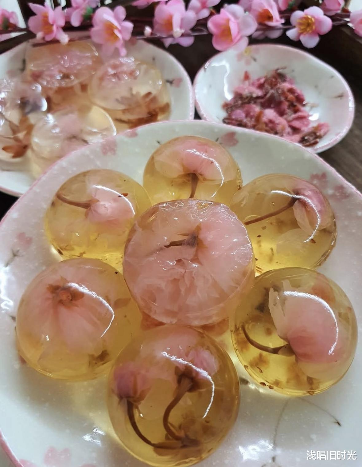 食材:白凉粉、盐渍樱花、红糖糖浆