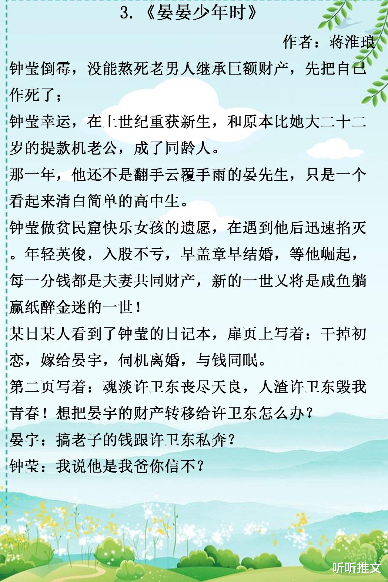书评:钟莹未熬死大她二十二岁提款机老公晏宇,反而出车祸意外身亡。幸而重生在上世纪,与晏宇成了同龄人。在遇到他后,钟莹决定和提前抱晏宇大腿,之后伺机离婚分得共同财产,做咸鱼躺平。本文文笔细腻生动,男女主从老夫少妻到同龄人,谈了一场别样的恋爱,人物性格不完美,男女主CP意外和谐,是一篇不可多得的故事。