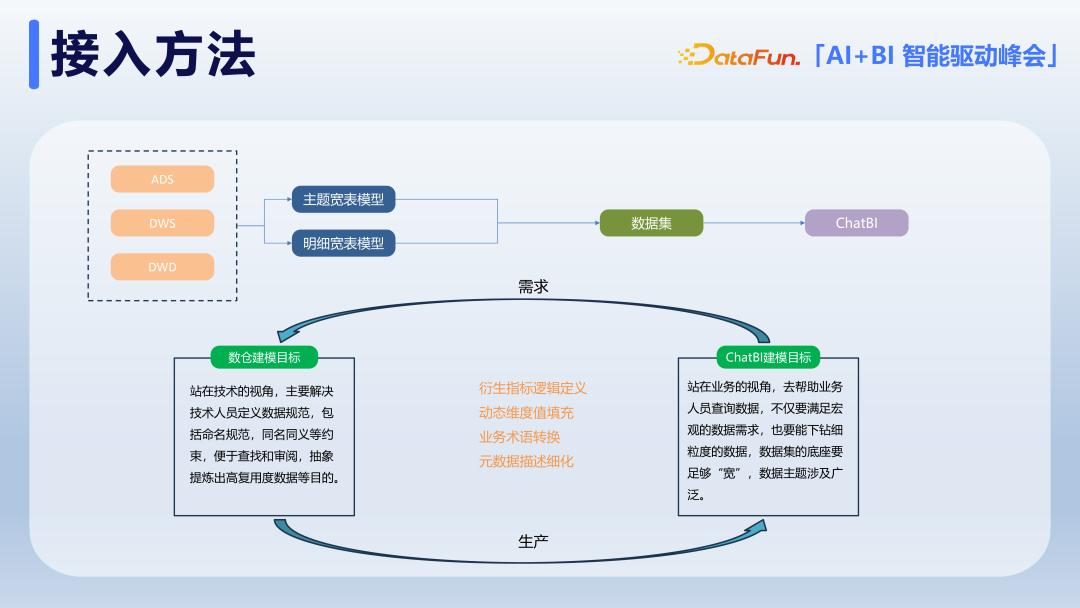 1. 在数仓中建立数据表与元数据的关联;2. 定义指标计算逻辑;3. 生成标准化模型,再接入 Chat BI