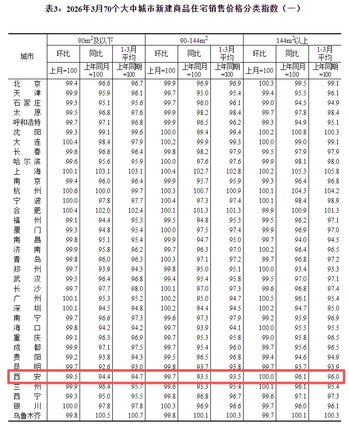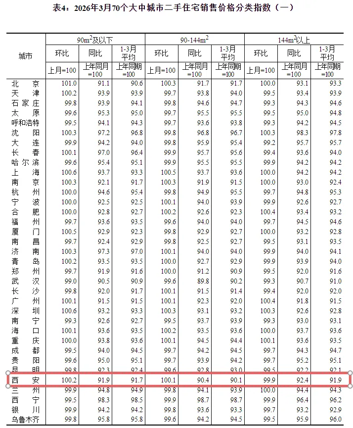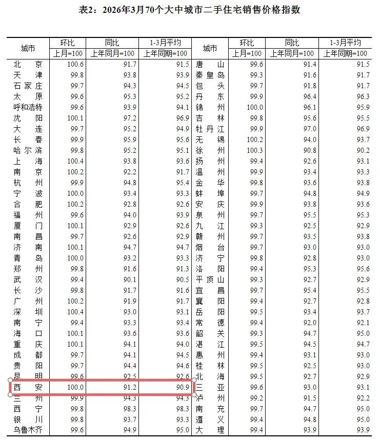 刚刚,国家统计局发布了《2026年3月份70个大中城市商品住宅销售价格变动情况》。最新数据显示:3月西安新房价格环比降0.2%,二手房环比持平。