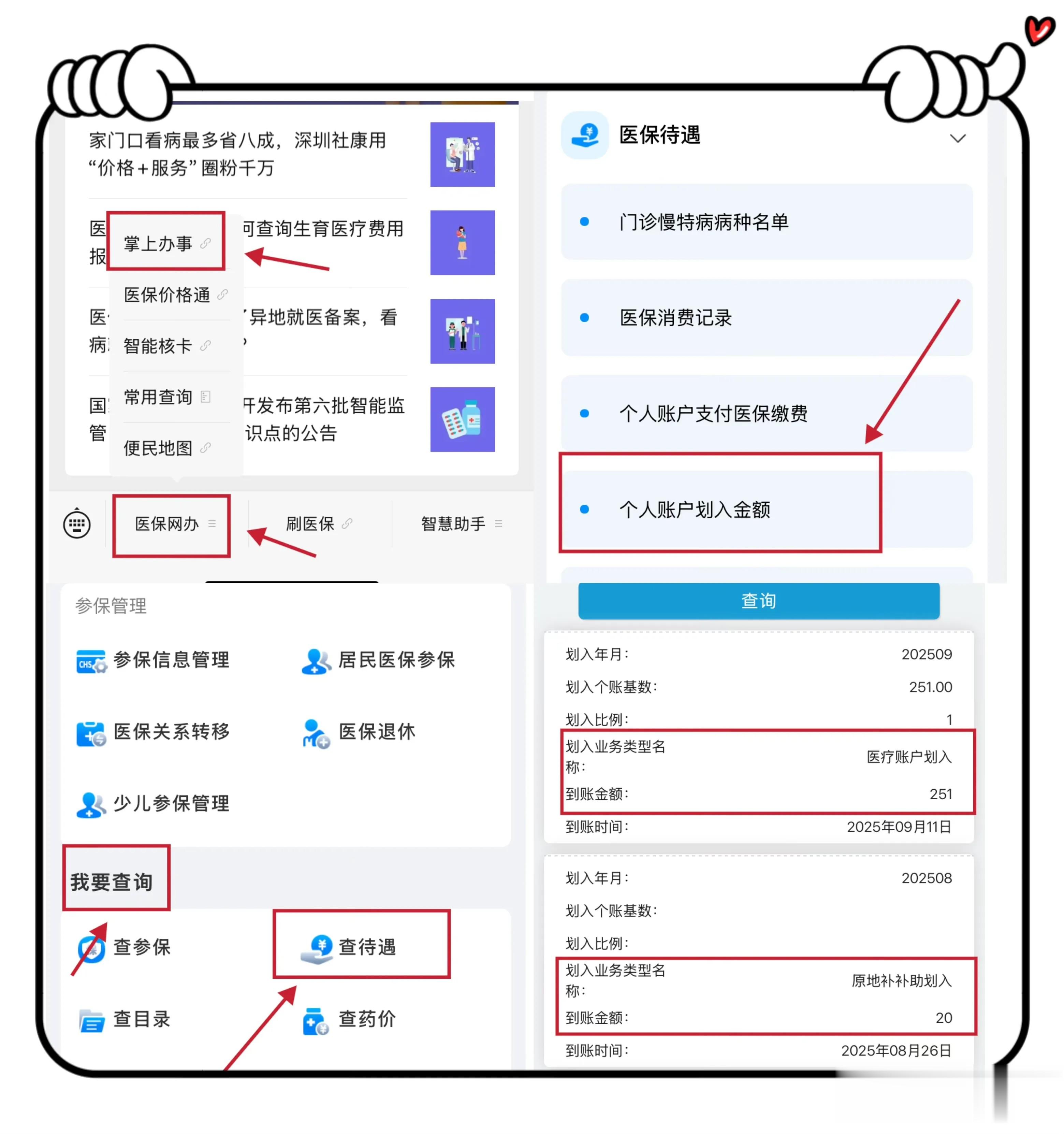 微信打开“深圳医保”公众号,点击左下角菜单栏“医保网办”→“掌上办事”,进入系统后点击“登录/注册”,刷脸登陆,下滑至“我要查询”模块,点击“查待遇”→“个人账户划入金额查询”。