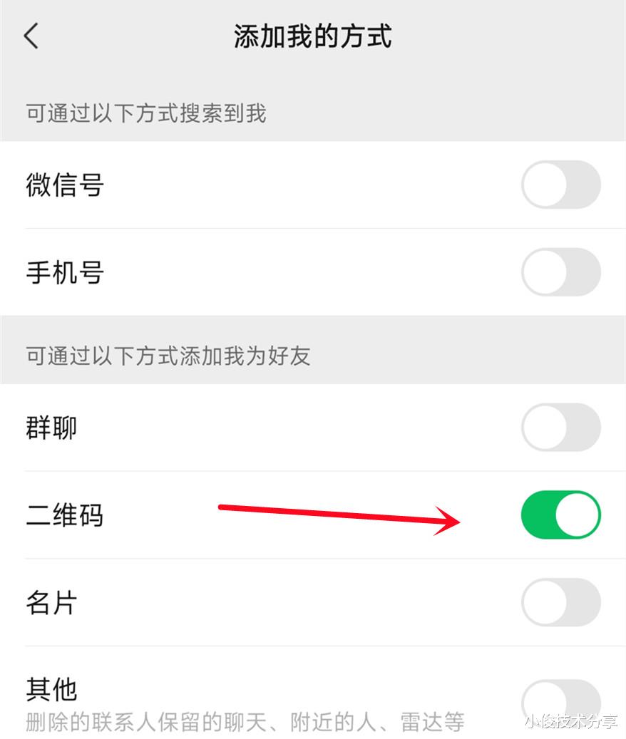 我们只保留一个二维码添加方式就可以了,为什么呢?因为这样别人就只能和我们面对面扫码添加,或者我们发送二维码给她,她才能添加我们,你想一下,既然能通过二维码添加我们,那肯定都是我们熟悉的人了,对不对!