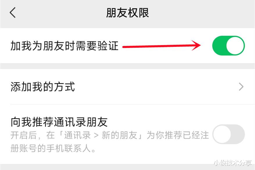 这样设置还没完,这样只是不让别人搜到你,添加你,你看像不要我们经过任何验证就能成功添加,这个也是因为我们一个开关没有打开导致的,那这个开关在哪里呢?咱们返回到上一页,然后把加我为好友时,需要验证的开关打开,这样任何人在添加我们时,就需要经过我们的验证可以了,主动权就在我们手里了,对于不认识的人,咱们不通过,他们就没办法了!