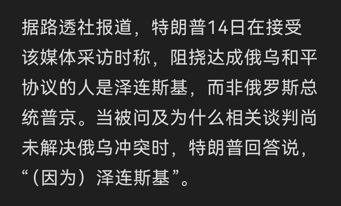 请注意!特朗普清楚地是指泽连斯基,而不是笼统的指乌克兰人在“阻挠达成俄乌和平协议”。