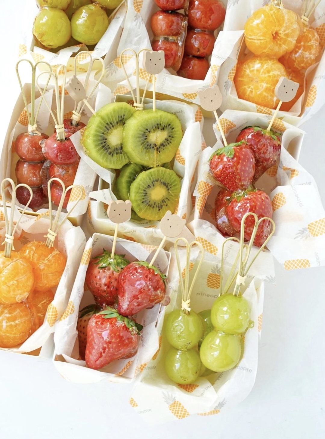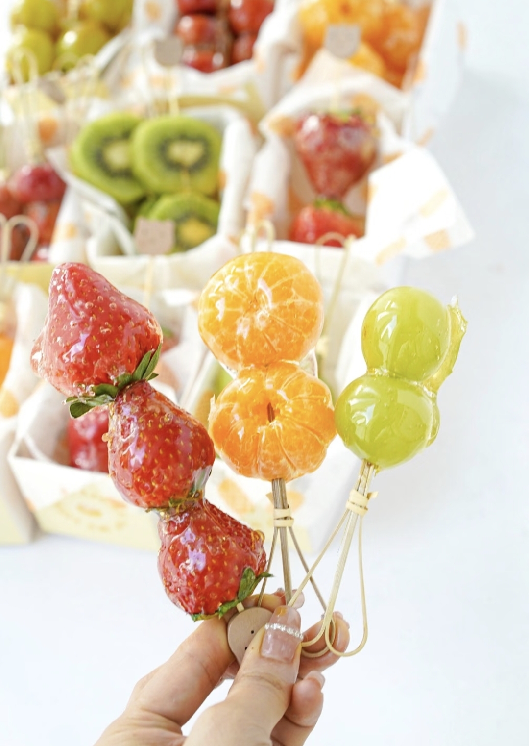 - 你爱吃的水果!传统山楂是灵魂,但是草莓、圣女果、橘子瓣、葡萄……只要能串起来的,都能裹上糖衣变“网红”。