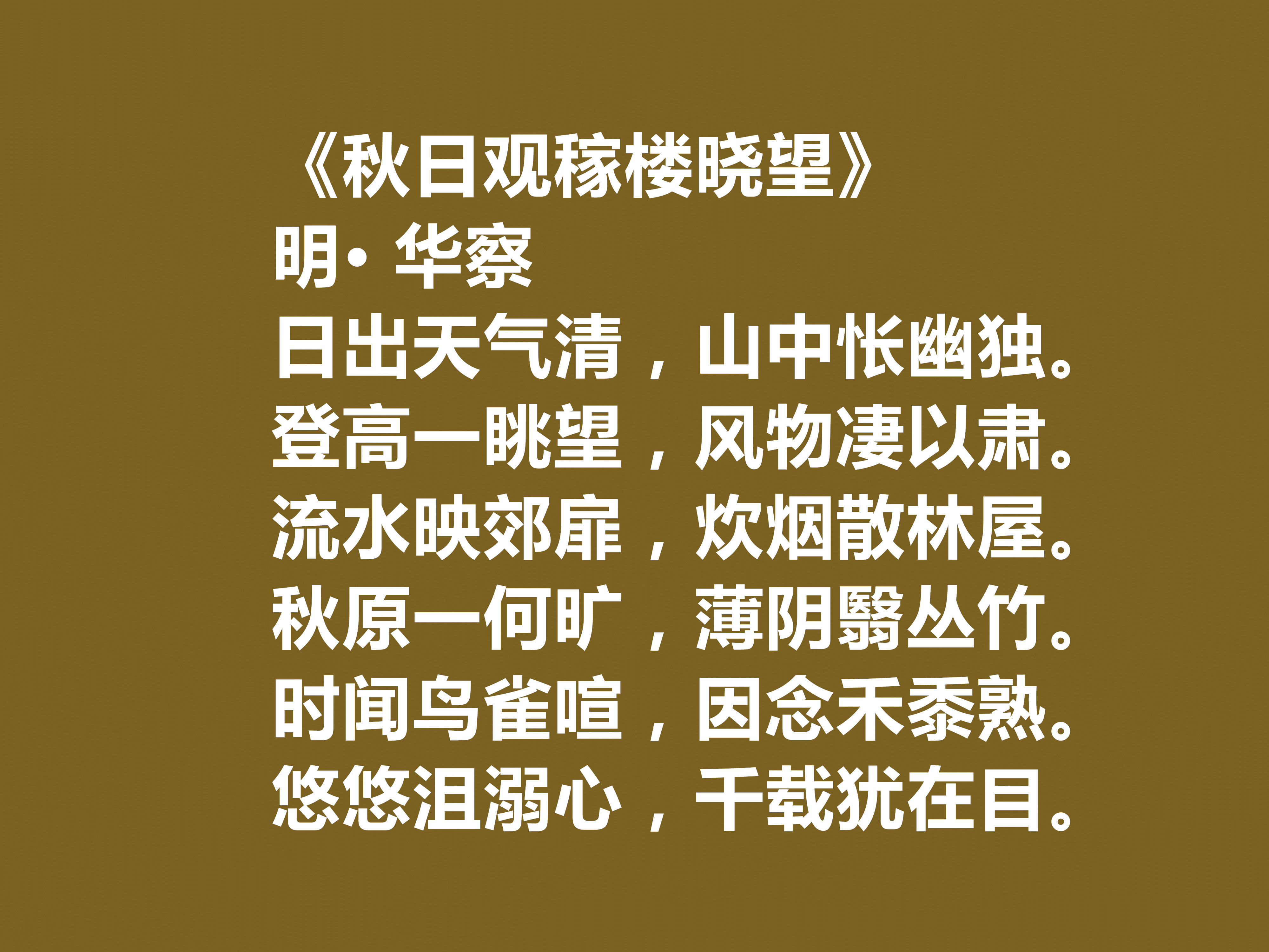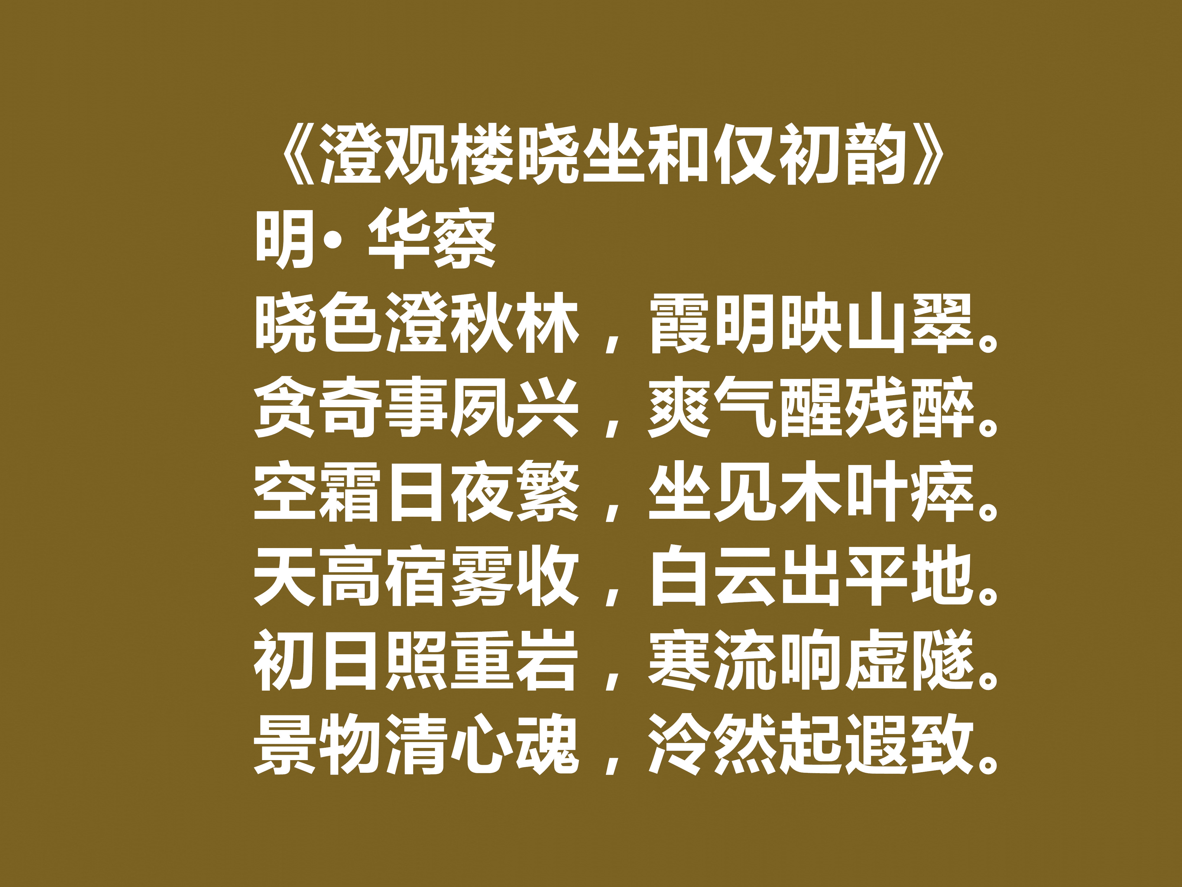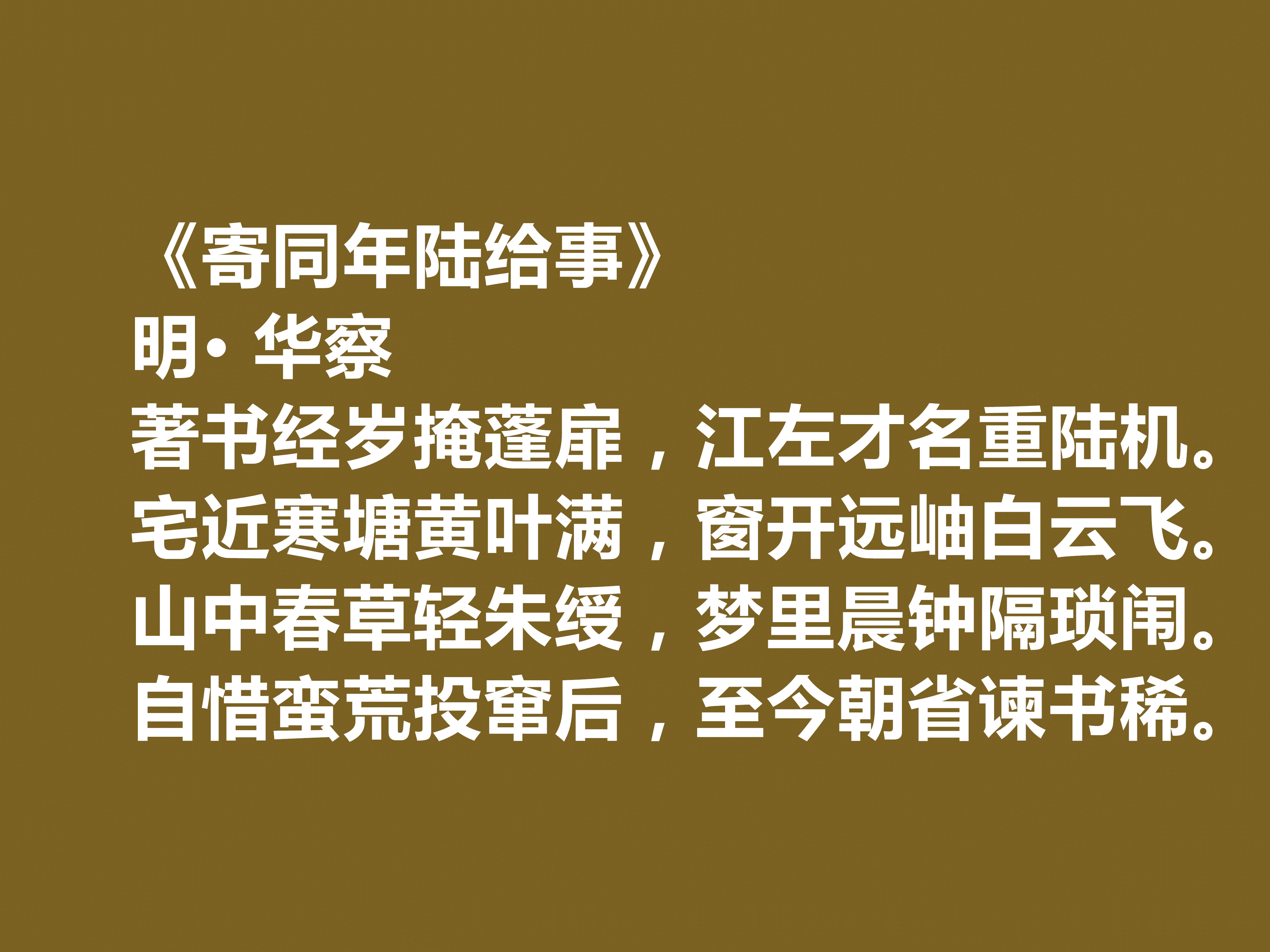 艺术上延续前期清雅淡远、质朴自然的风格,格律严谨却不呆板,语言平实却不浅白,意境空灵悠远。按题材划分,其诗歌大致分为三类:一是官场感怀诗,抒发仕途感悟与气节坚守;二是山水田园诗,描摹江南水乡风光,表达归隐之乐;三是交游唱和诗,记录与友人的诗文往来,尽显文人情谊,三类诗作共同构成了华察完整的精神世界,也让他的诗歌在明代诗坛留下了浓墨重彩的一笔,下面欣赏他的十首诗。