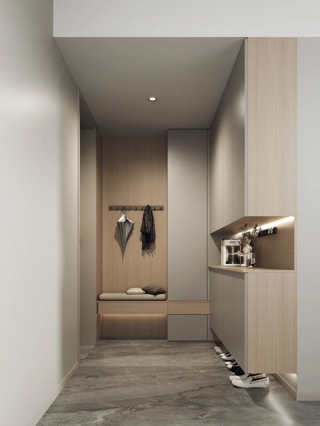 照明是玄关设计中不可忽视的一环。除了天花板上的主灯外,还应在玄关柜内部安装柔和的LED灯带或感应灯,以提供便捷的照明效果。这些灯光不仅能够方便夜间取物,还能营造出温馨舒适的氛围。在选择灯光时,应以暖色调为主,避免过于刺眼或昏暗,让归家的每一步都充满温馨与期待。