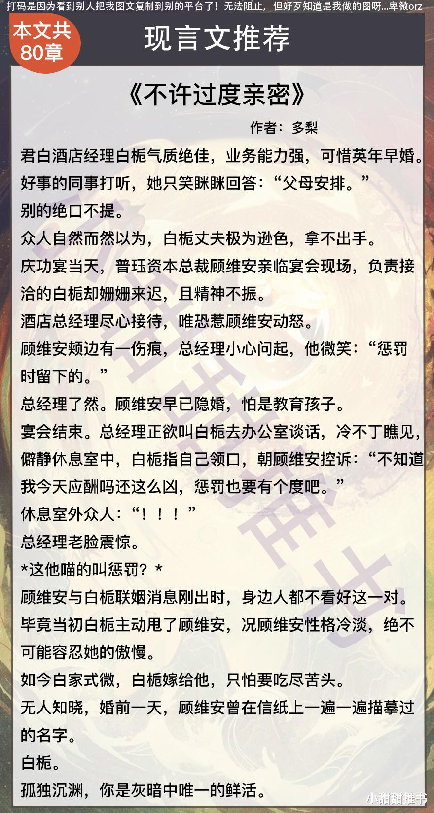 大家好,这期给大家推荐的是6本现言小说,甜文系列!第一本《不许过度亲密》作者:多梨【阅读提示】|小嘴抹了鹤顶红·能屈能伸