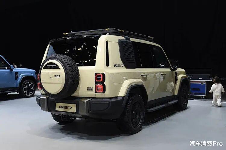 包括前后外凸的保险杠、凸起的轮眉、侧开尾门、外挂式备胎等等都是其野性的写照,一些细节处的黑化处理也进一步强化了其时尚感。另外说明一点,V27会有小书包版和备胎版选择,其尺寸为4909(小书包版)/5055(备胎版)x1976x1855/1894(带行李架)mm,轴距2910mm。