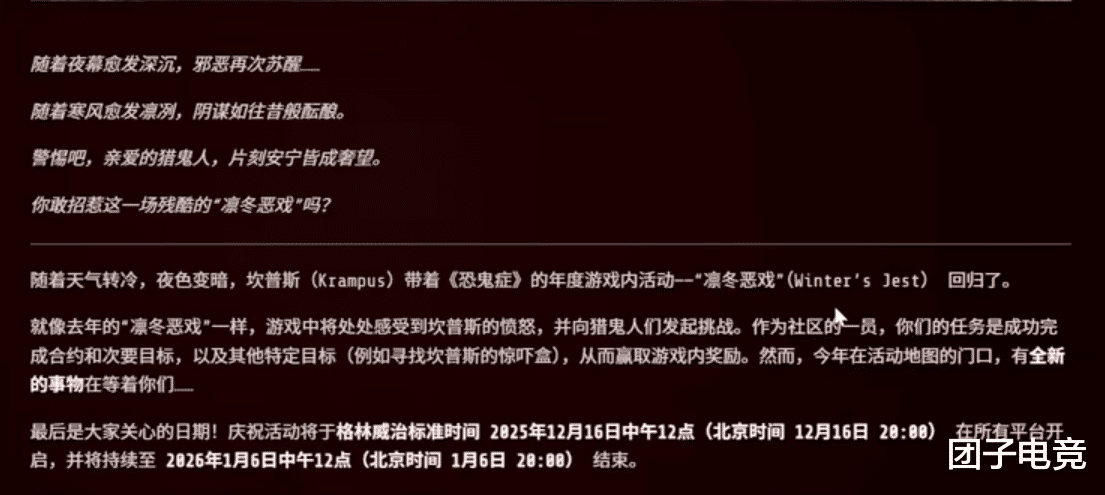 英国游戏工作室Kinetic Games为其风靡全球的合作恐怖游戏带来了第二次年度冬季活动“冬季诡戏”,而这次的主角,是源自欧洲古老民间传说的惩戒之灵——坎卜斯。