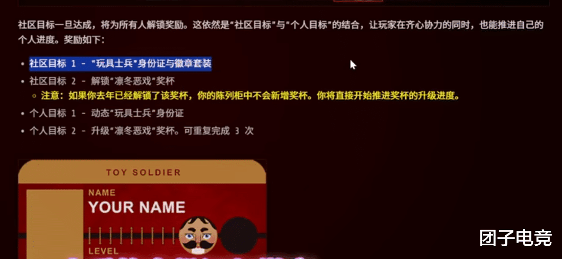 今年社区目标的奖励包括独特的玩具士兵身份证及徽章套装,以及象征荣誉的冬季诡戏奖杯。对于去年已经获得过奖杯的老玩家,系统将直接为其开启奖杯升级的进度。