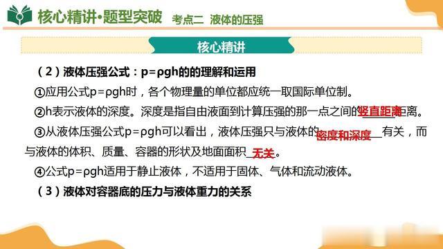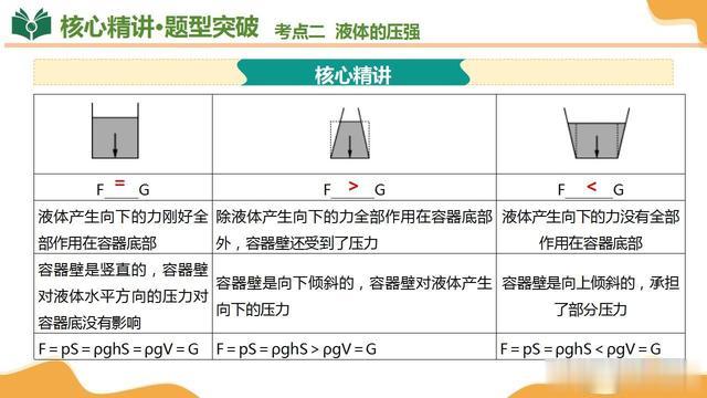 压强计算题最爱挖坑:孩子总把“压力=重力”,结果一碰到不规则容器就翻车!记住口诀:“液体压强看深度,固体压强看接触”(公式p=ρgh和p=F/S别混淆)