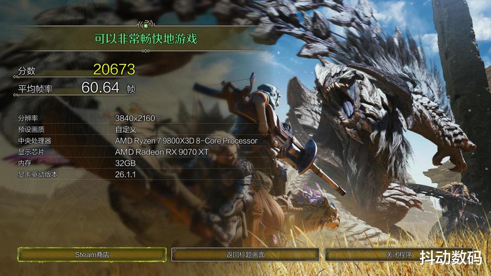 「怪物猎人 荒野」游戏4K分辨率,预设画质极高,未开启FSR帧生成技术时游戏平均帧数60.64 FPS,分数20673。
