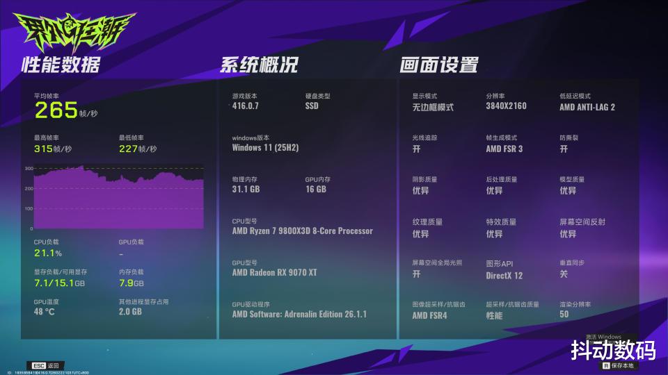 手动开启FSR帧生成技术时,游戏平均帧:265 FPS,最低帧:227 FPS。平均帧数提升了177%。