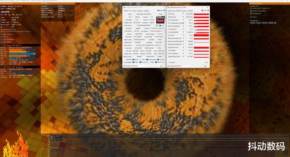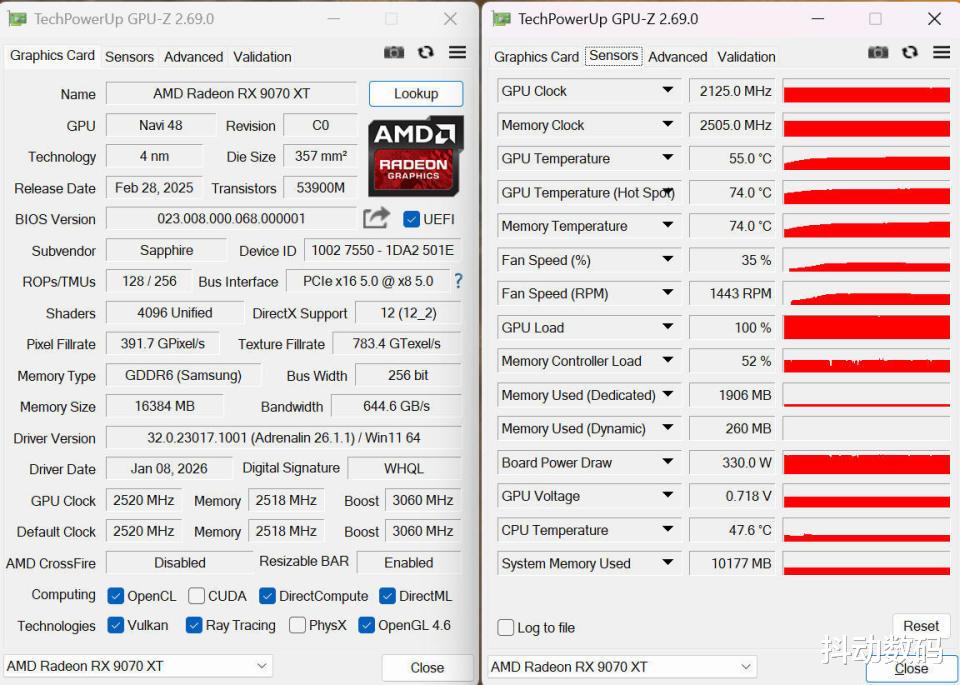 测试方面,首先是GPU-Z 查看蓝宝石NiTRO+RX9070XT氮动极光显卡规格,基于Navi 48 核心设计,4096个流处理器,GPU频率2520MHz,加速频率3060MHz。