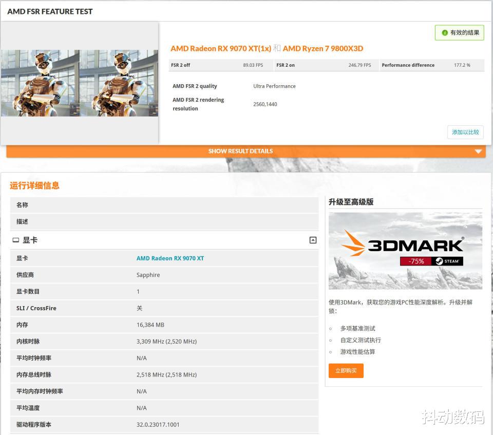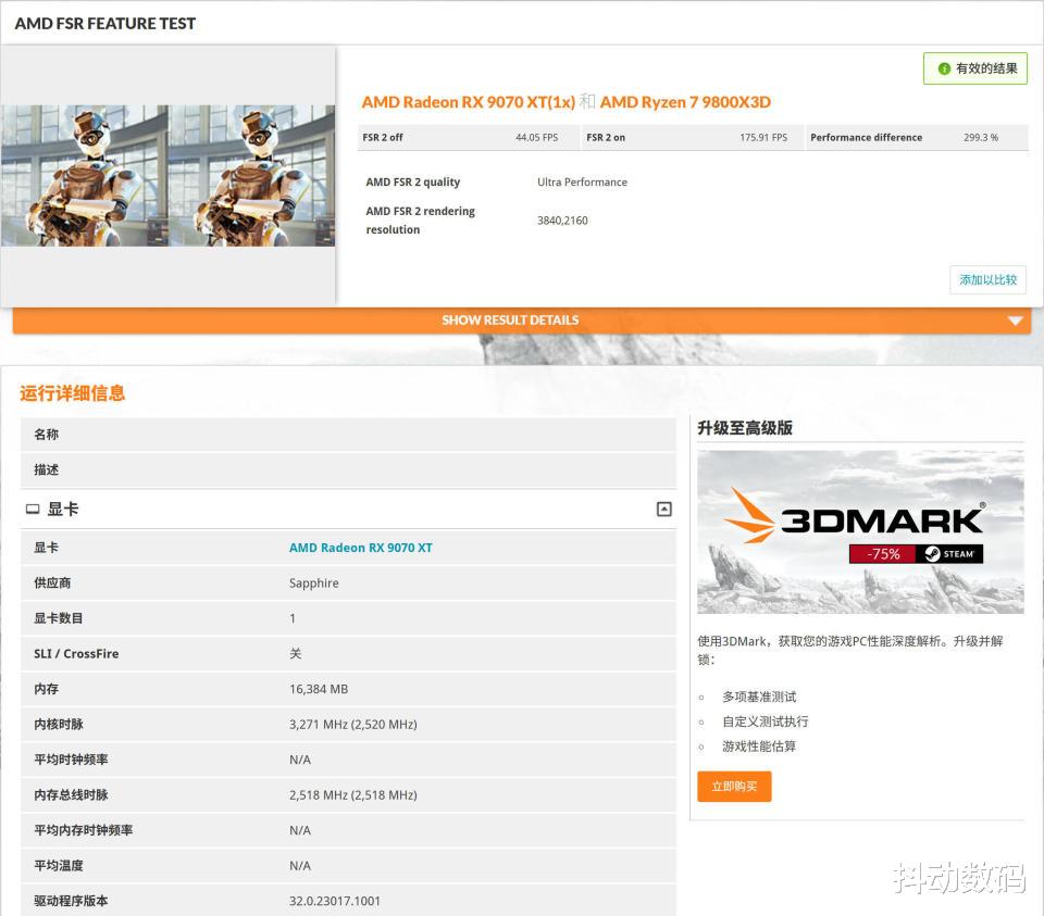 3DMark测试中针对FSR 2的测试,针对4K分辨率测试开启FSR 2开启前后帧数变化。可以看到在FSR 2 off时平均帧数44.05 FPS,FSR 2 on时平均帧数 175.91 FPS。性能提升接近300%。