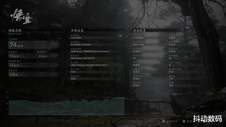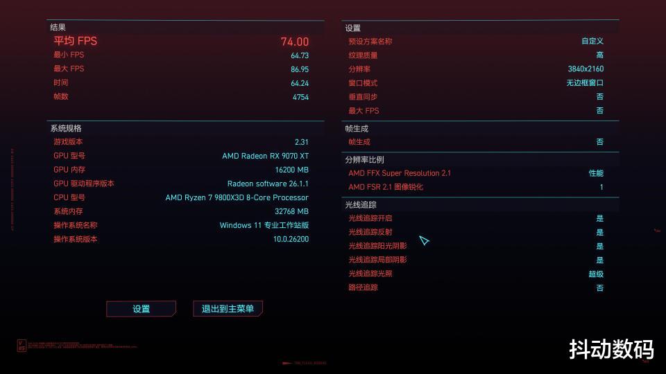 同样分辨率同样设置下,开启FSR 帧生成之后,游戏平均帧:74 FPS,最低帧:62 FPS。平均帧数提升了189%。