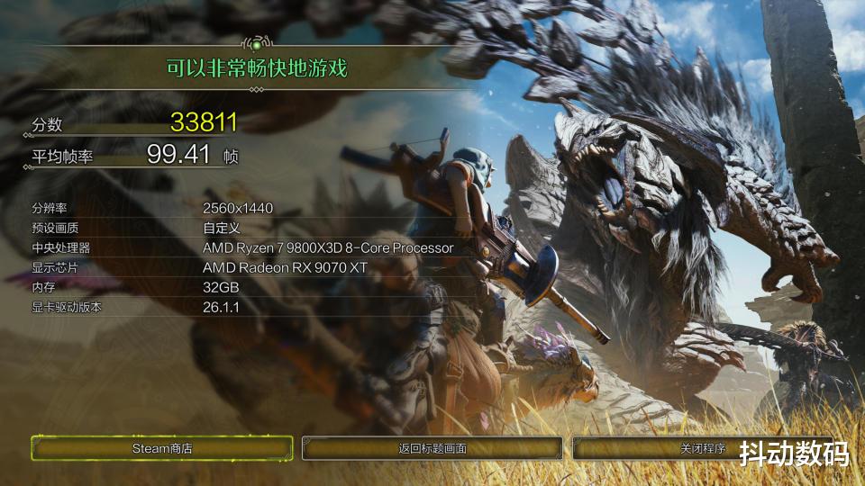 「怪物猎人 荒野」游戏2K分辨率,预设画质极高,未开启FSR帧生成技术时游戏平均帧数99.41 FPS,分数33811 。