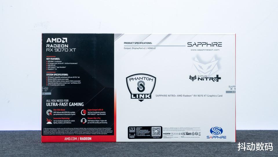 蓝宝石NiTRO+ 氮动极光AMD Radeon RX9070 XT产品外包装采用简约大气的视觉设计语言,以经典红白主色调,加上富贵的金色元素进行视觉点缀,彰显产品的高端定位。包装正面显著标注了16GB GDDR6显存容量及Phantomlink系统。