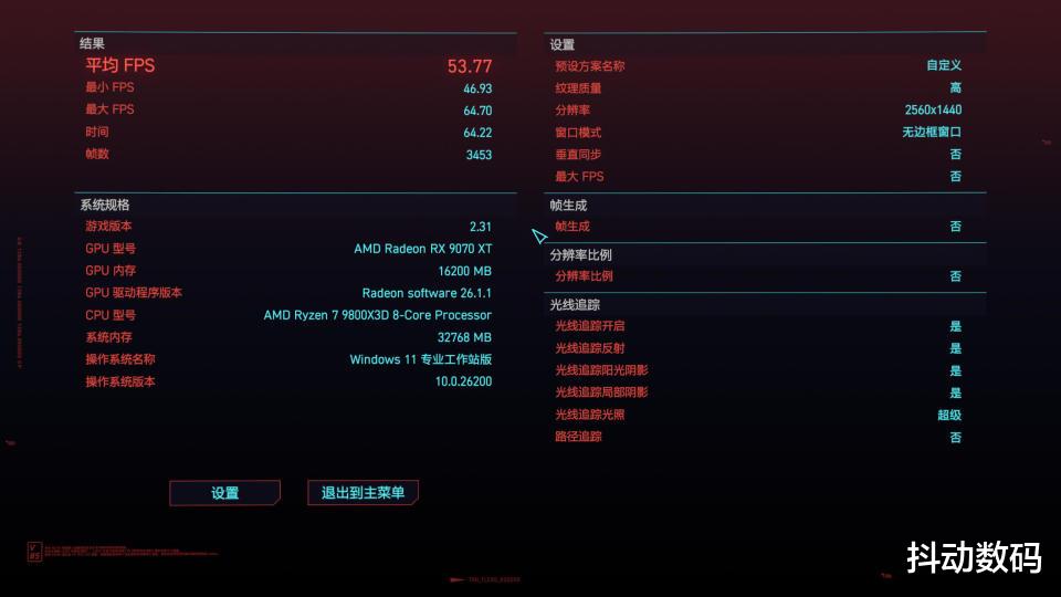 2K分辨率下影视级画质,开启光追的情况,未开启FSR帧生成技术时,游戏平均帧:53.77 FPS,最低帧:46.93 FPS。
