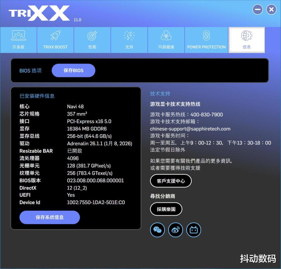 最后一栏信息下可以查看当前显卡硬件规格信息,以及技术支持,可以快速找到客服。