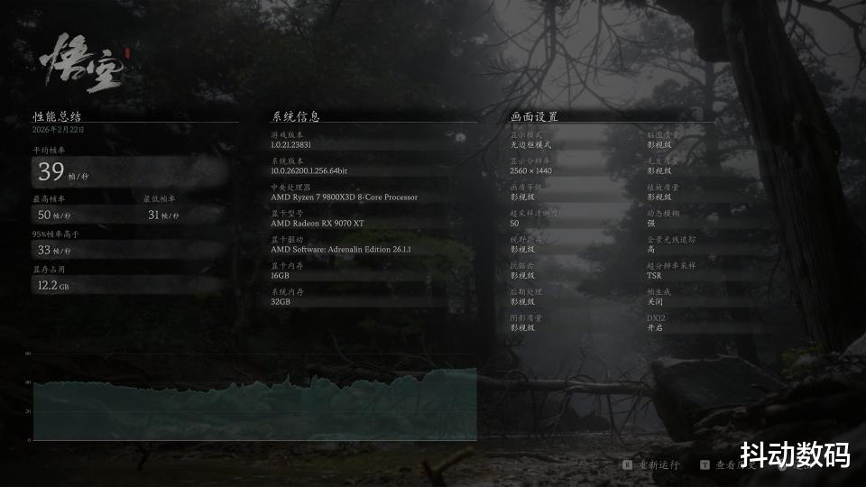 「黑神话悟空」游戏在2K分辨率下影视级画质,光追设置为「高」时,超级分辨率采样设置为 TSR,既未开启FSR帧生成模式,设置超级采样率50时游戏平均帧:39FPS,最低帧:31 FPS。