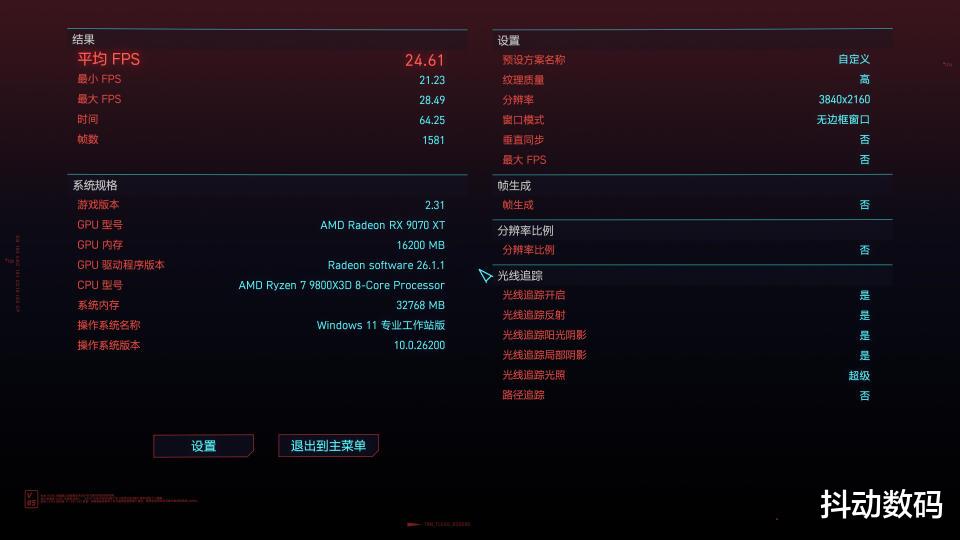 「2077」游戏在4K分辨率下影视级画质,开启光追的情况,未开启FSR帧生成技术时游戏平均帧:24.64 FPS,最低帧:21.23 FPS。