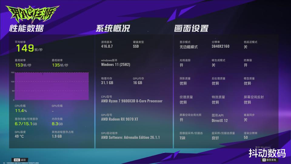 「界外狂潮」游戏在4K分辨率、影视级画质、开启光追的情况,未开启FSR帧生成技术下游戏平均帧:149 FPS,最低帧:135 FPS。