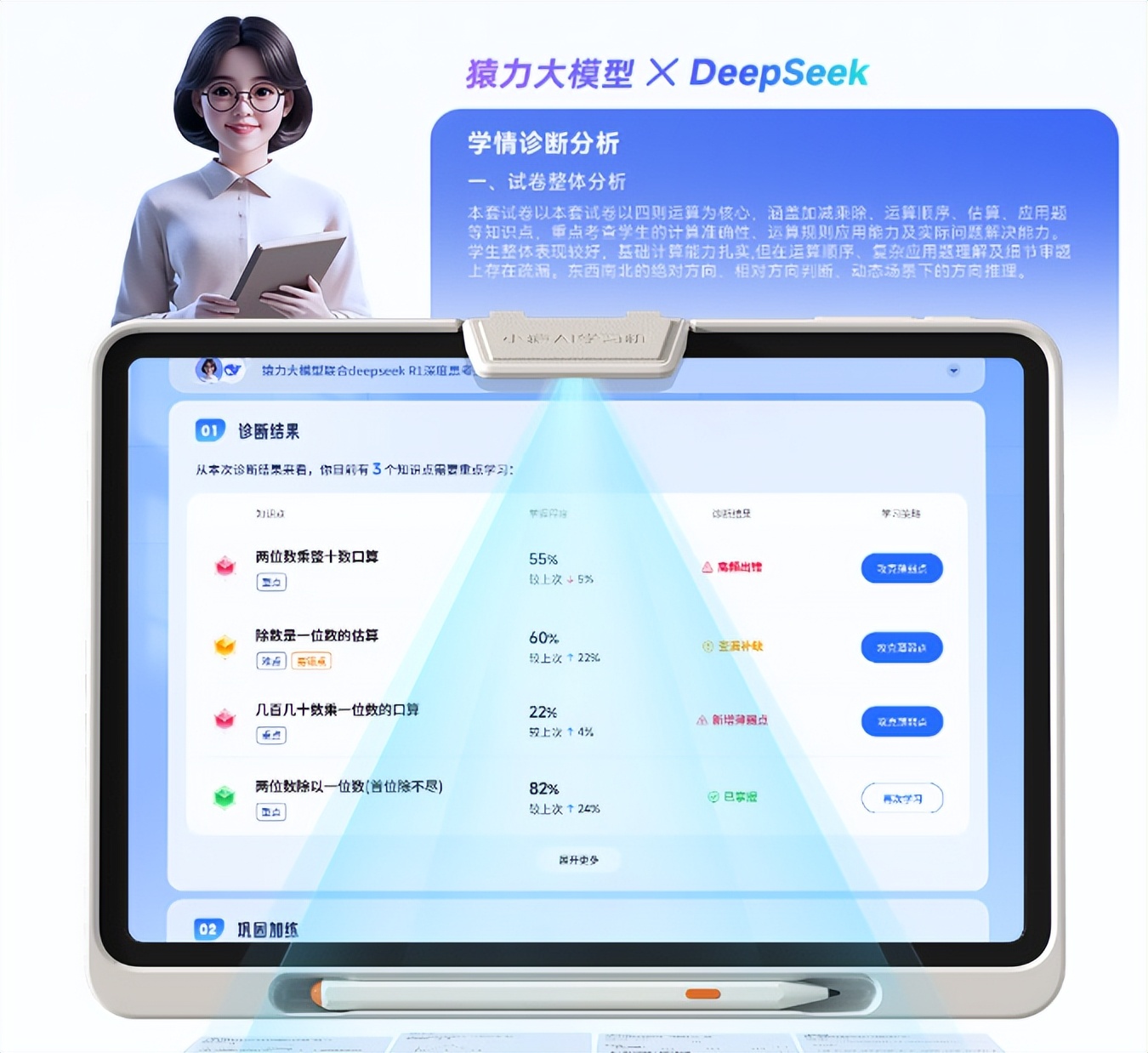 当然,买学习机不是买显示器,核心还得看“脑子”,而P40 Ultra的脑子就是它那套恐怖的“双AI模型”。DeepSeek-R1加上猿力大模型,这两位AI大神联手,让这台机器拥有了透视眼般的诊断能力。孩子做完一套数学卷子,它不需要死板地批改,而是像做CT扫描一样,3秒钟内就能把你家神兽的知识盲区扒得干干净净,直接生成一张比蜘蛛网还密的知识图谱。它不光告诉你哪道题错了,还能一针见血地指出是因为公式没背熟,还是逻辑掉坑里了。特别是那个作文批改功能,从立意到修辞七个维度给你打分,比语文老师面批还要细致,这种被AI“看穿”的感觉,既高效又有点让人头皮发麻。