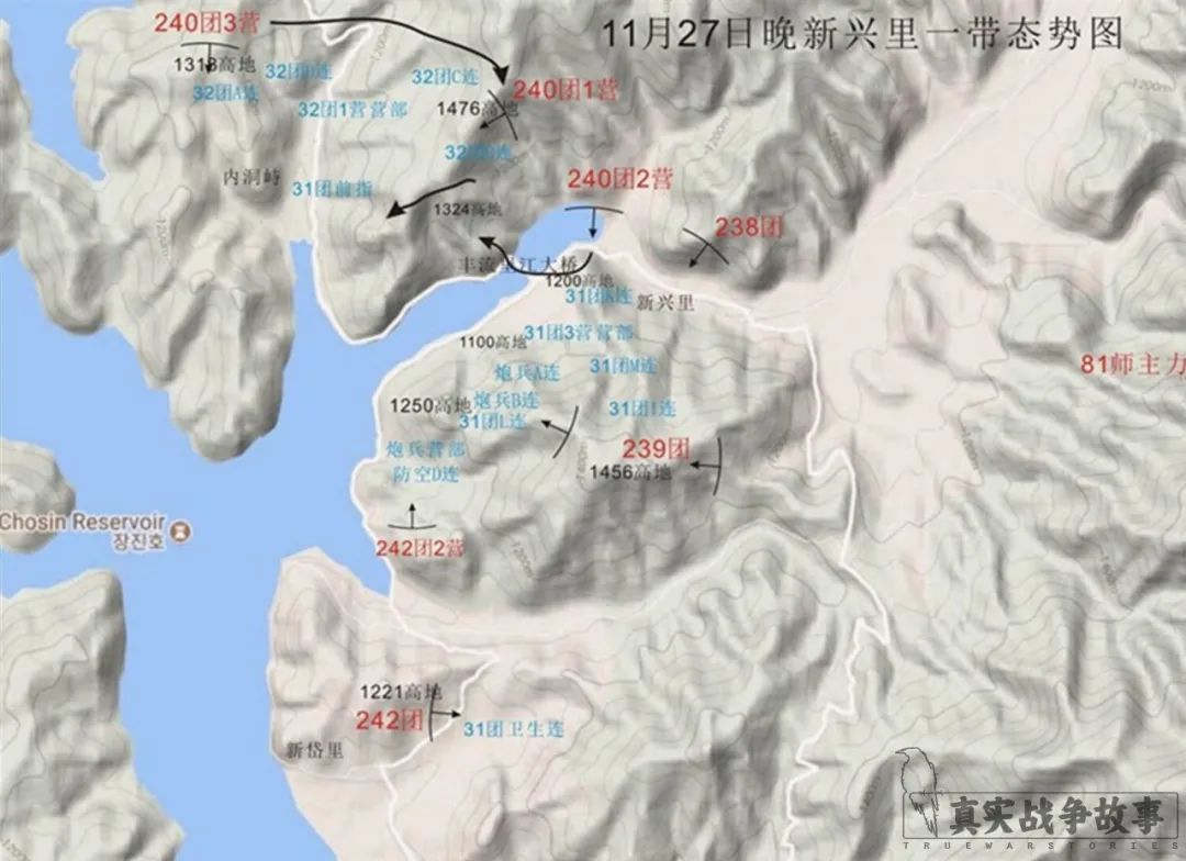 据师侦察队前夜侦察,Y字右端长津湖东岸的内洞峙、新兴里一带有敌人1个营,其中内洞峙有1个连。