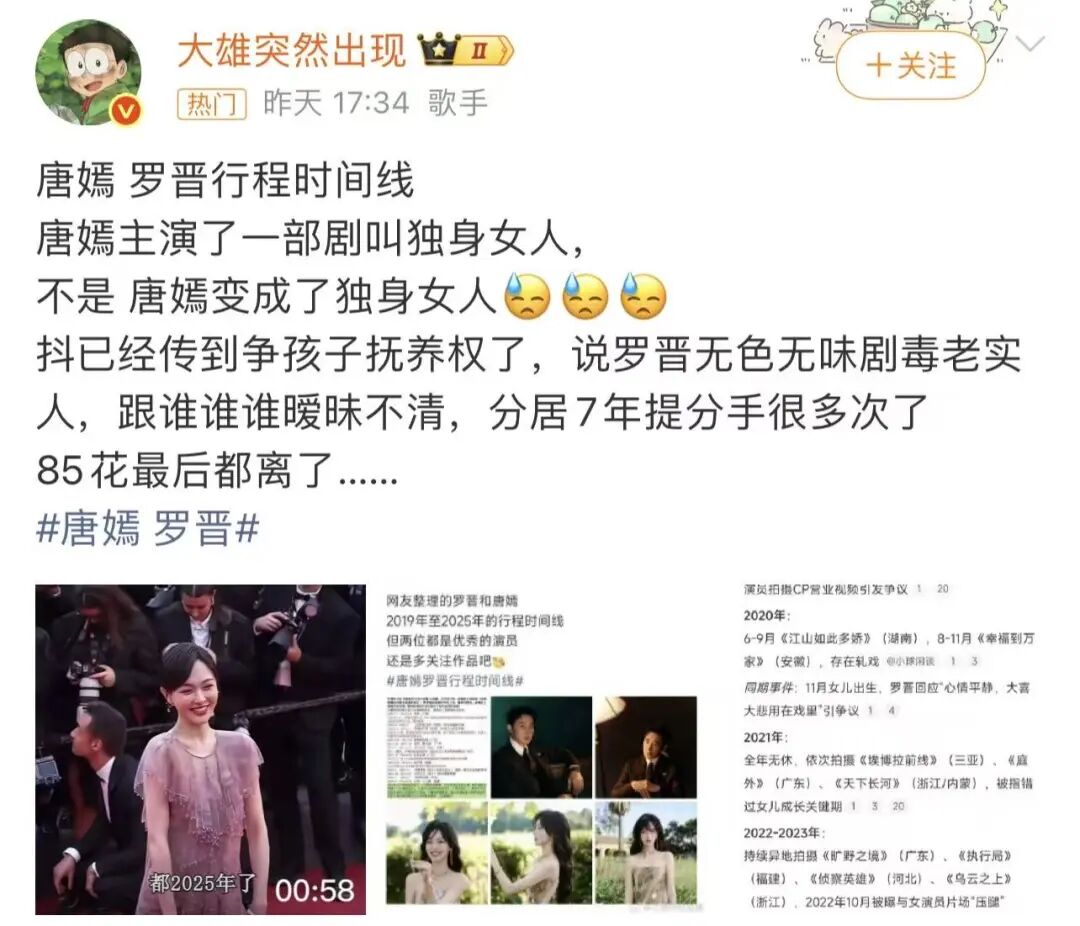 其实早在 2024 年 8 月,就有婚变传闻冒头,只是没掀起水花。直到今年 10 月,一档综艺里主持人说唐嫣 “被罗晋宠成花”,直接炸了锅。粉丝立马甩出证据:唐嫣生日罗晋只发了张风景图,罗晋新剧宣传唐嫣零互动,连往年必有的生日祝福都没了。更绝的是,有人扒出罗晋 2023 年拍《旷野之境》时,连续 300 天没回家,女儿第一次叫爸爸都是通过视频。