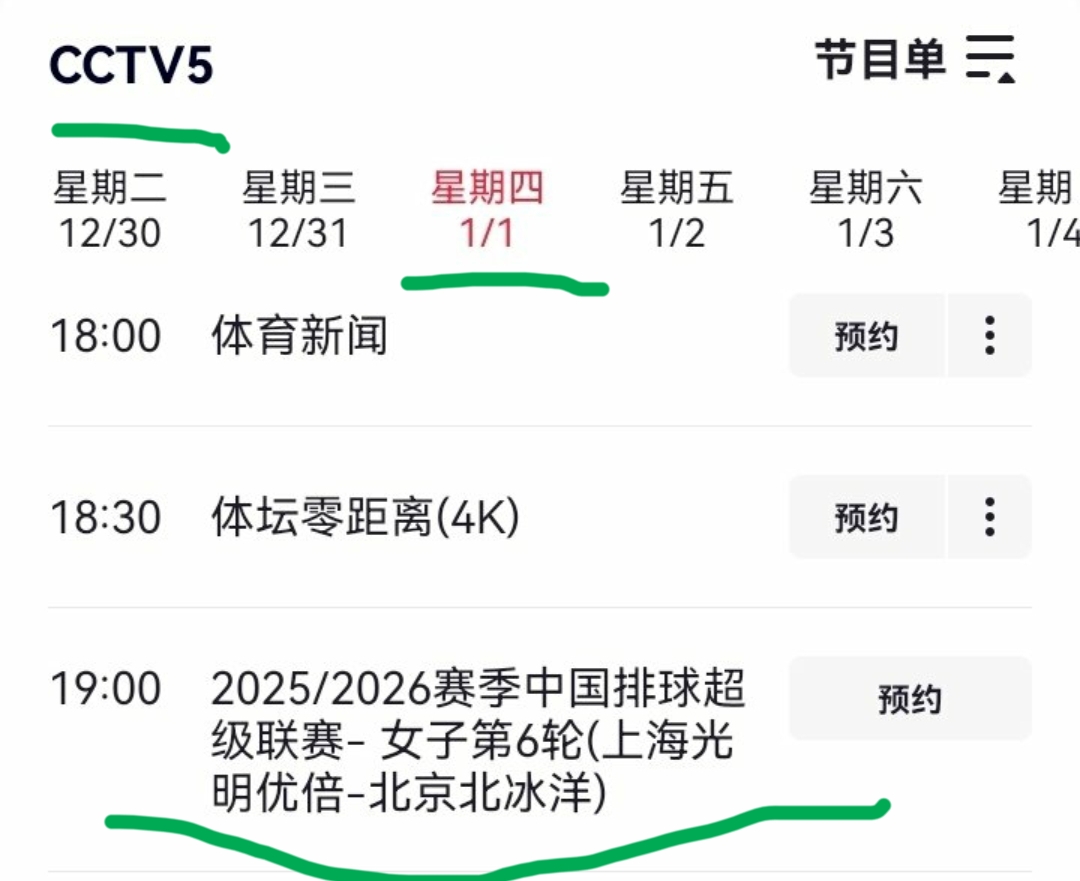 最新的第六轮比赛时间,把上海女排对阵北京女排的比赛,提前到1月1号的晚上七点进行!中央电视台体育频道现场直播本场比赛。