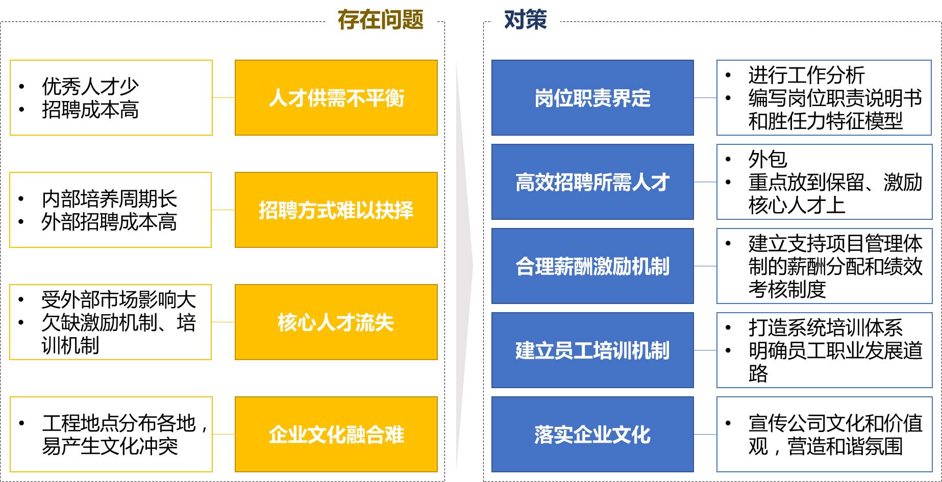 4、企业文化融合难。由于公司业务的要求,公司工程地点分布各地,员工国籍、区域、民族、语言等不完全相同,容易产生文化差异,造成文化冲突。为了规避文化差异,合理化解文化冲突,公司对于不同背景的人才采用不同的人力资源管理方式。如何将企业文化贯穿在多种人力资源管理方式之中是公司人力资源管理部门面临的巨大挑战。