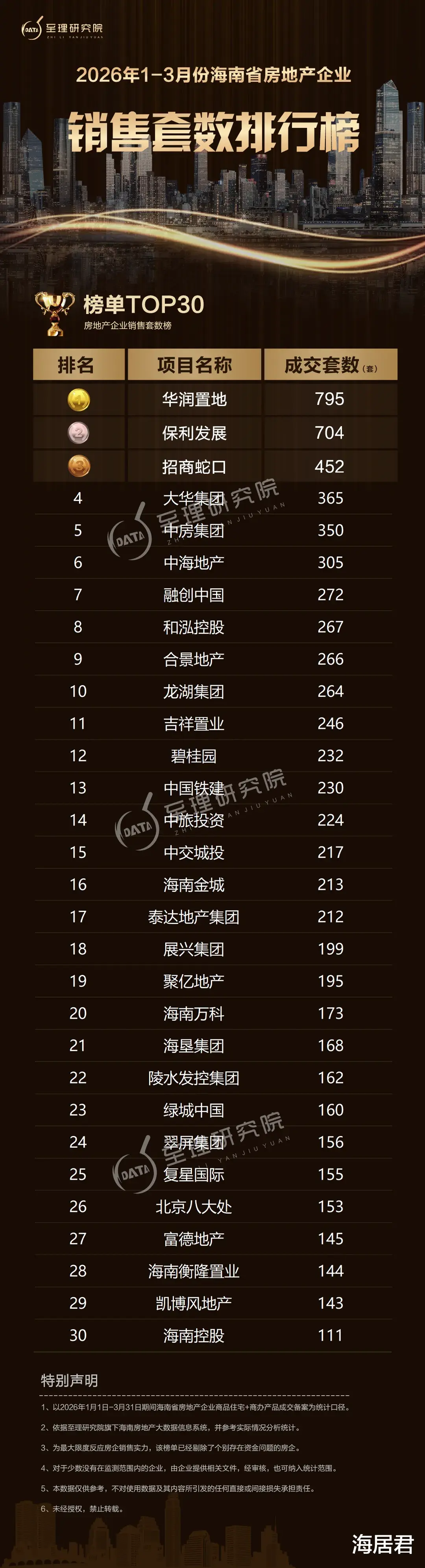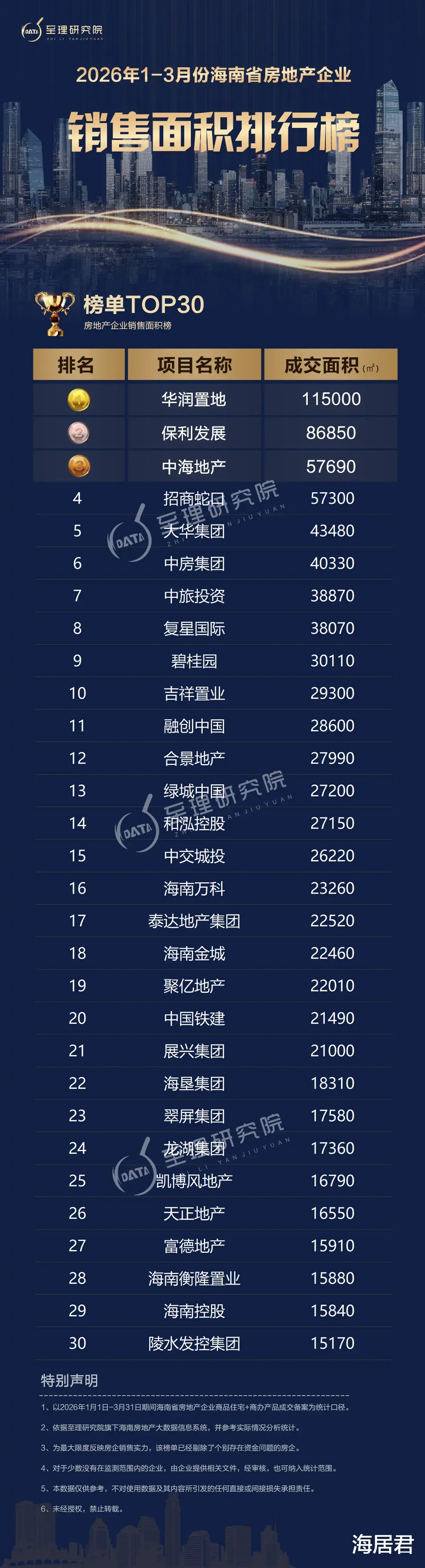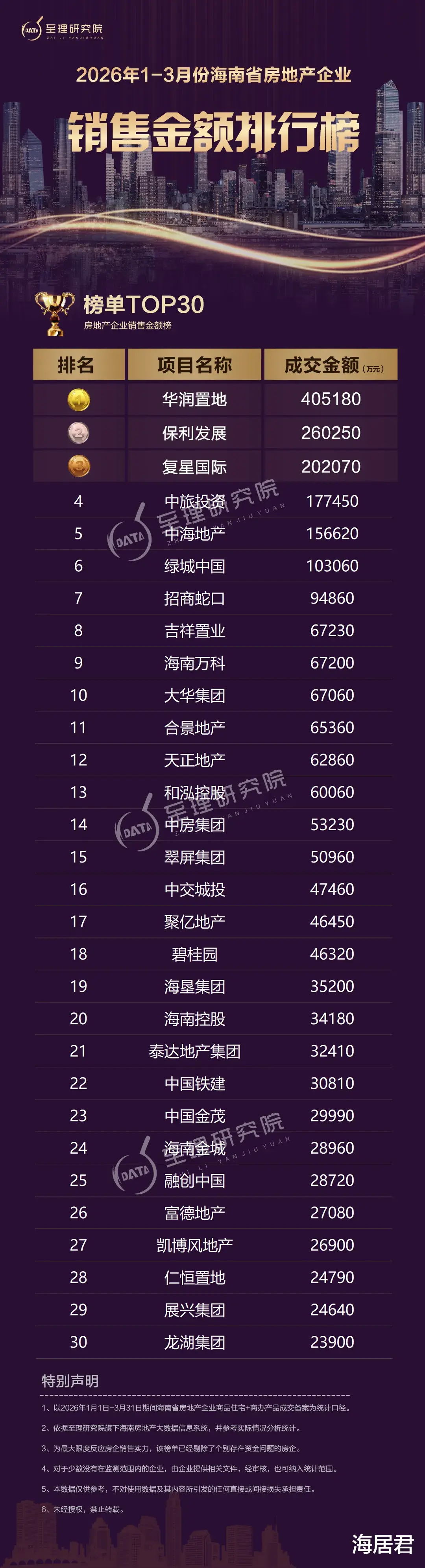 海南房地产专业研究机构至理研究院依据其旗下海南房地产大数据信息系统,发布《2026年1-3月海南房地产企业业绩榜》,披露海南房地产企业销售业绩情况,主要依据各大企业住宅、商业、办公产品成交备案情况形成排名。