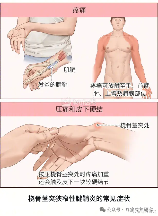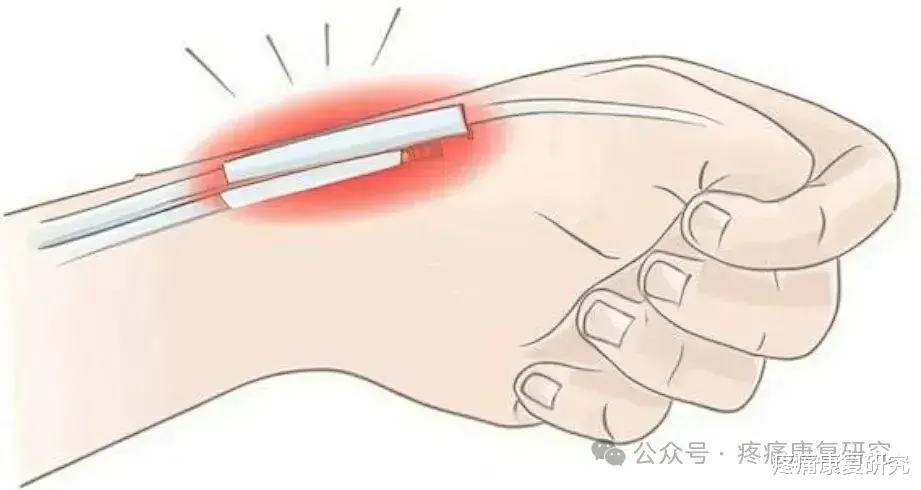 在手腕桡侧能找到一个明确的压痛点,有时按压时还会感觉到轻微的肿胀,少数人可能伴随手腕轻微红肿。