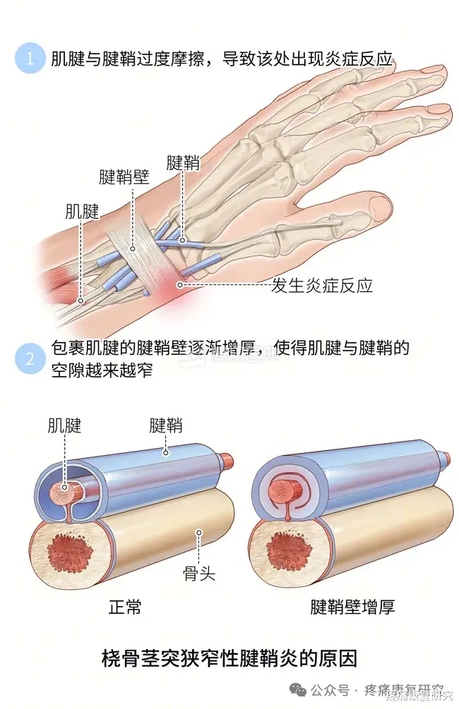 就是 “肌腱” 和 “腱鞘” 因长期摩擦、劳损,出现充血、水肿、增厚,导致 “滑动不顺畅”: