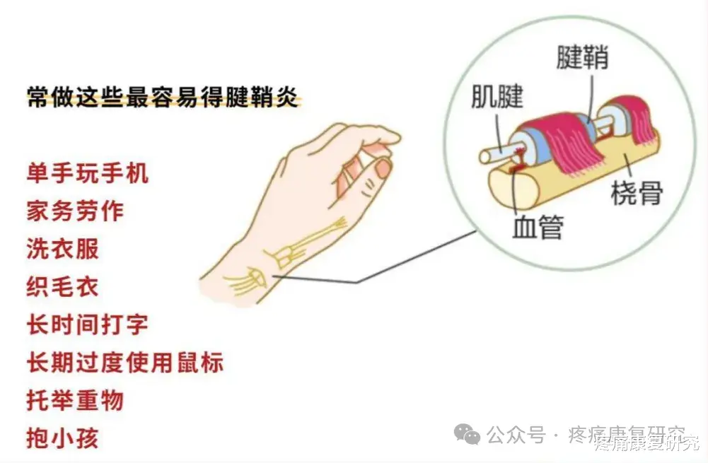 正常情况下,肌腱会在腱鞘内灵活滑动(比如手指屈伸时,屈肌腱就在手指根部的腱鞘里来回动)。但如果长期重复一个动作(比如频繁敲键盘、玩手机、抱孩子),肌腱和腱鞘会反复摩擦 —— 就像 “绳子” 在 “管子” 里反复蹭,时间久了,两者都会受损。
