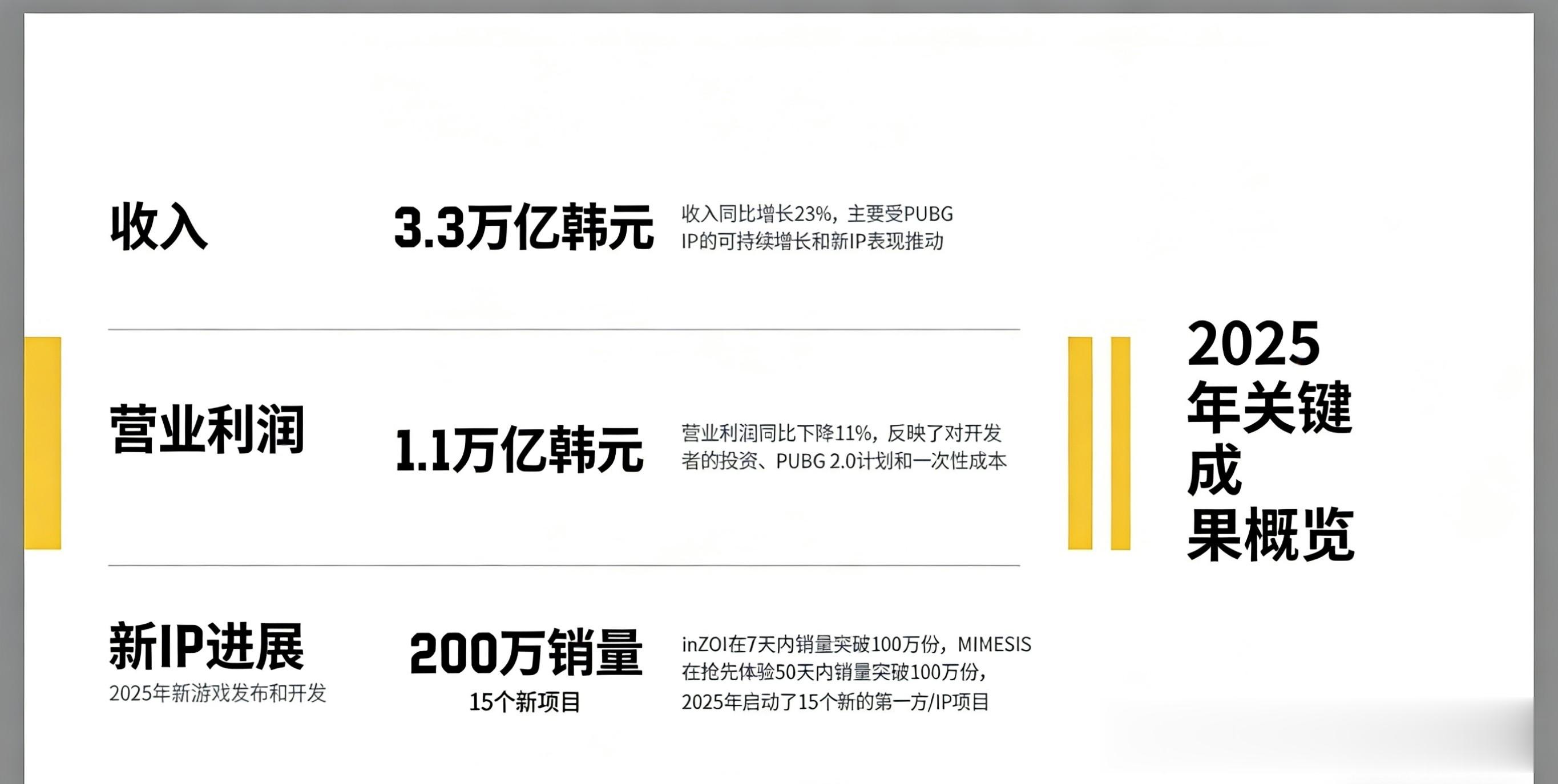 财报数据显示,KRAFTON2025年全年销售额高达3.33万亿韩元,换算成人民币约158亿,营业利润更是突破1.1万亿韩元,刷新公司成立以来的最高纪录。