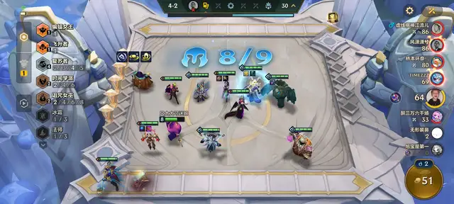 4-1拉了8级,通过双重目的送的刷新,嫖到了剑姬,莫甘娜,以及泽拉斯,阵容逐步像时间蔷薇转,开出了4复苏2时间的羁绊,4-2选择了辅助魔像战力海克斯,这里说一下重点。