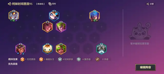 这套阵容常规是以狗头主坦,小火龙和韦鲁斯双C,但是柯妹个人推荐,放弃主坦,以贝蕾亚为核心凑装备,多余的装备再分配给韦鲁斯和小火龙。